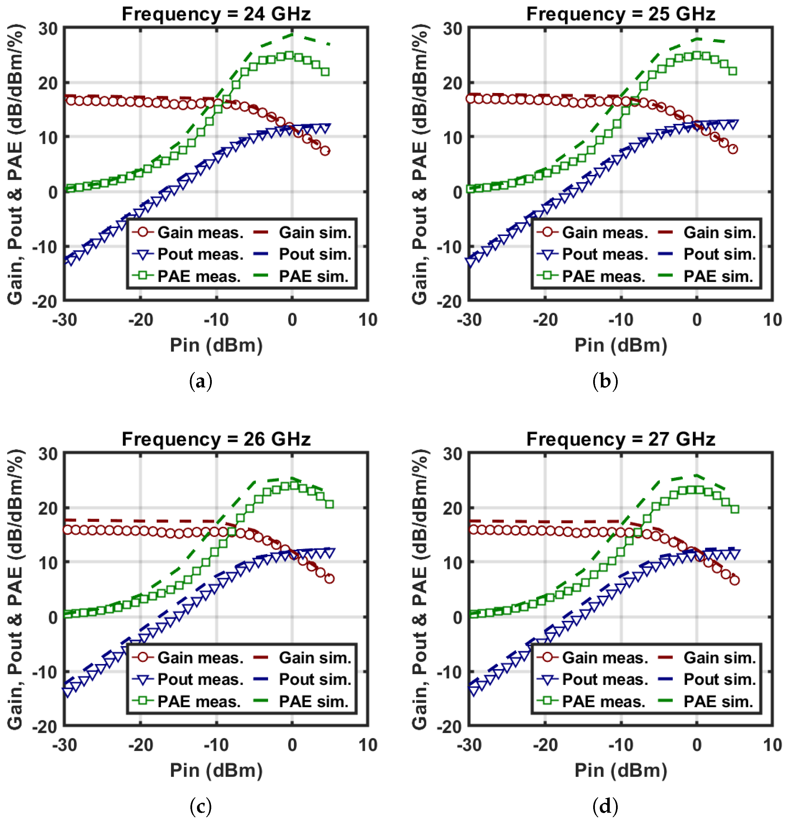 Figure 13. Measured and simulated power gain, output power, and PAE versus input power at the frequencies of (a) 24 GHz, (b) 25 GHz, (c) 26 GHz and (d) 27 GHz.