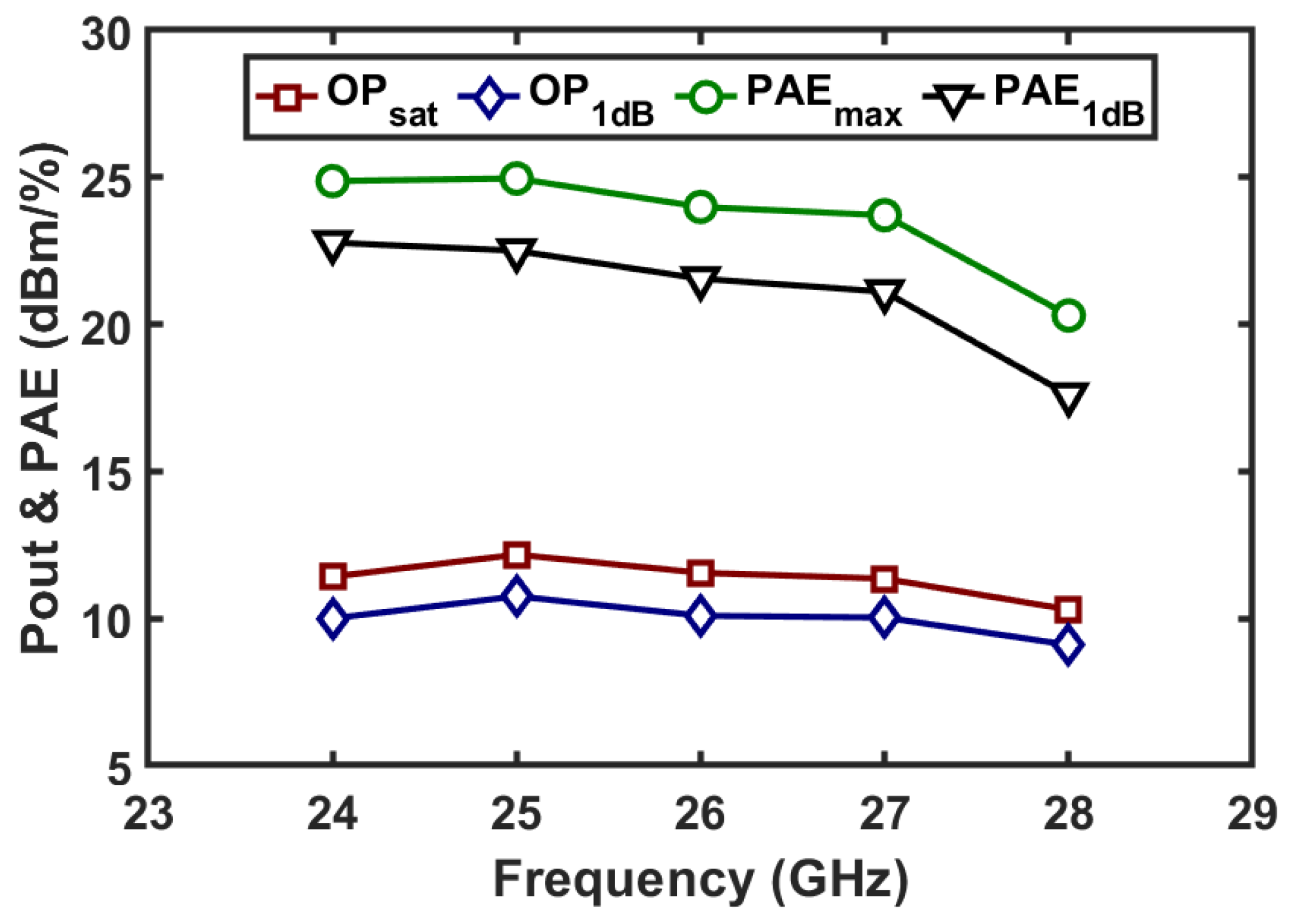 The linearity of the TX channel is also evaluated with swept input power levels. The measured power gain, output power, and PAE of the two-stage amplifier in TX mode versus the input power are depicted in Figure 13. The amplifier achieves saturated output power of 11.4, 12.2, 11.6 and 11.4 dBm and a peak PAE of 24.9%, 25%, 24% and 23.2% at 24, 25, 26 and 27 GHz, respectively. In addition, at the 1 dB gain compression point, the amplifier provides over 10 dBm output power with a PAE value above 21.1% at 24, 25, 26 and 27 GHz. The output power and PAE versus frequency are depicted in Figure 14.