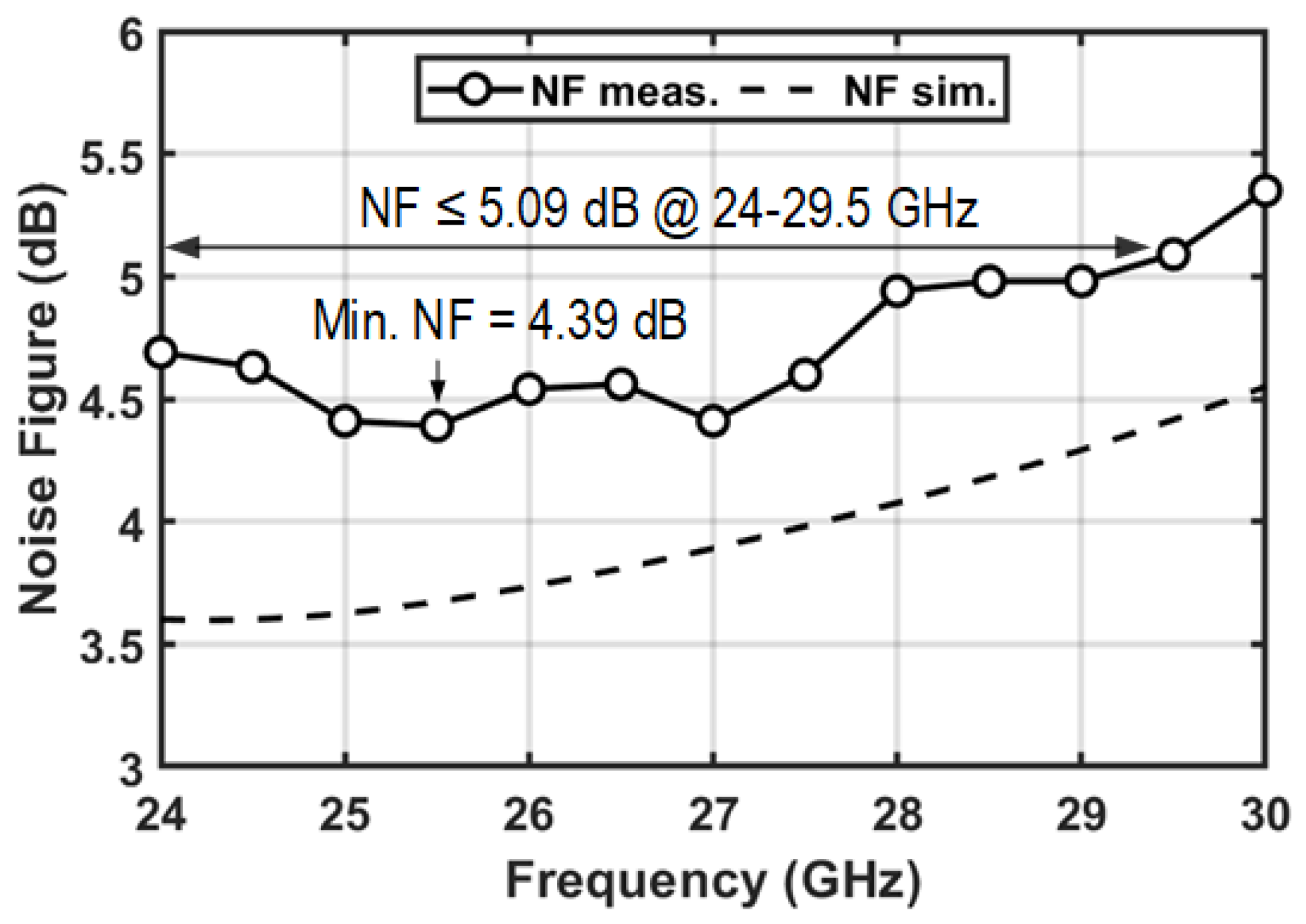 21. Yang, B.; Li, N.; Liu, Y.; Lu, H.; Gao, H.; Wang, S.; Xu, J.; He, X.; Yan, N.; Gu, Q.J.; et al. A 17.7-to-29.5GHz transceiver front-end with 3.3dB NF and 20.2dBm OP1dB in 65nm CMOS. In Proceedings of the 2025 IEEE International Solid-State Circuits Conference (ISSCC), San Francisco, CA, USA, 16–20 February 2025; Volume 68, pp. 1–3. [Google Scholar]