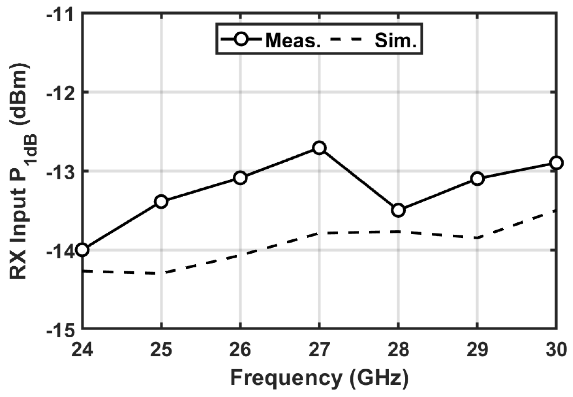 In Figure 17, the measured input P1dB of the RX channel is shown. The RX chain has a measured input P1dB of −14 to −12.7 dBm across the 24–30 GHz band, which is relatively close to the simulated result.