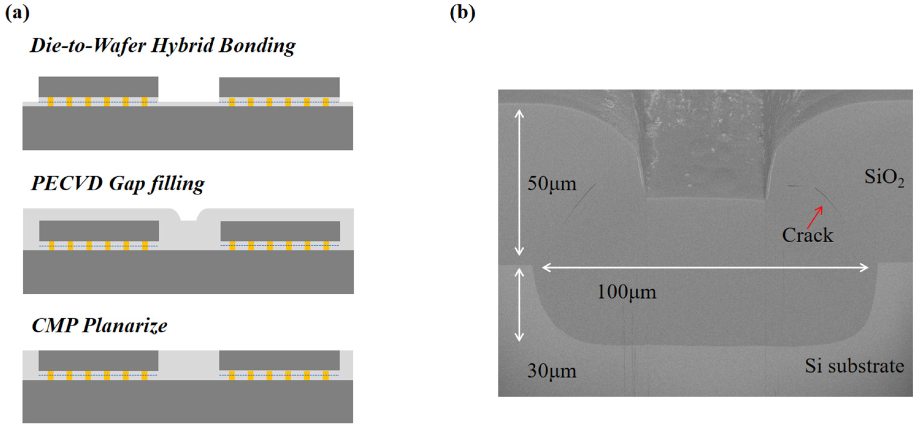 Figure 1. PECVD-fabricated SiO2 chiplet gap filling samples: (a) schematic of the chiplet gap filling process flow; (b) BSE SEM image of the sample cross-section.
