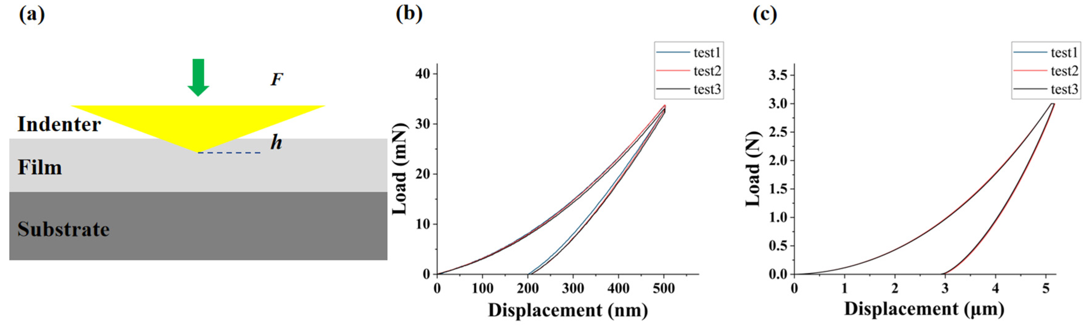 Nanoindentation technology, with its high-precision mechanical characterization capability at the micro/nanoscale, is a suitable solution for SiO2 film characterization. Based on the Oliver–Pharr theory [20], this technology can efficiently extract Young’s modulus (E) from load–displacement curves, and it has been widely used for characterizing biological, metallic, and semiconductor materials [21,22,23].