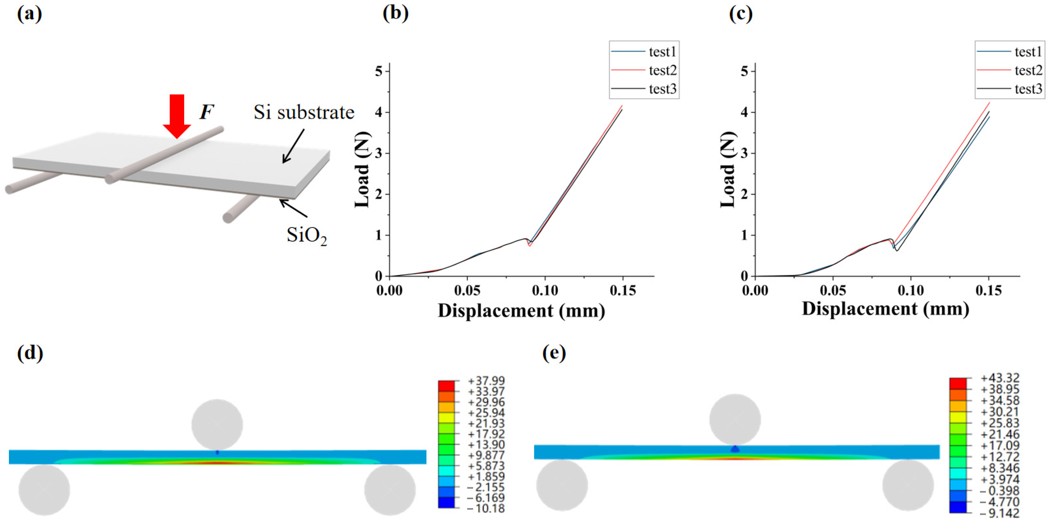 Figure 3. Characterization of SiO2 via three-point bending tests: (a) test schematic; (b) load–displacement curve with the SiO2 film facing downward; (c) load–displacement curve with the Si substrate facing downward; (d) maximum principal stress cloud diagram of the three-point bending testing with the SiO2 film facing downward; (e) maximum principal stress cloud diagram of the three-point bending testing with the Si substrate facing downward.