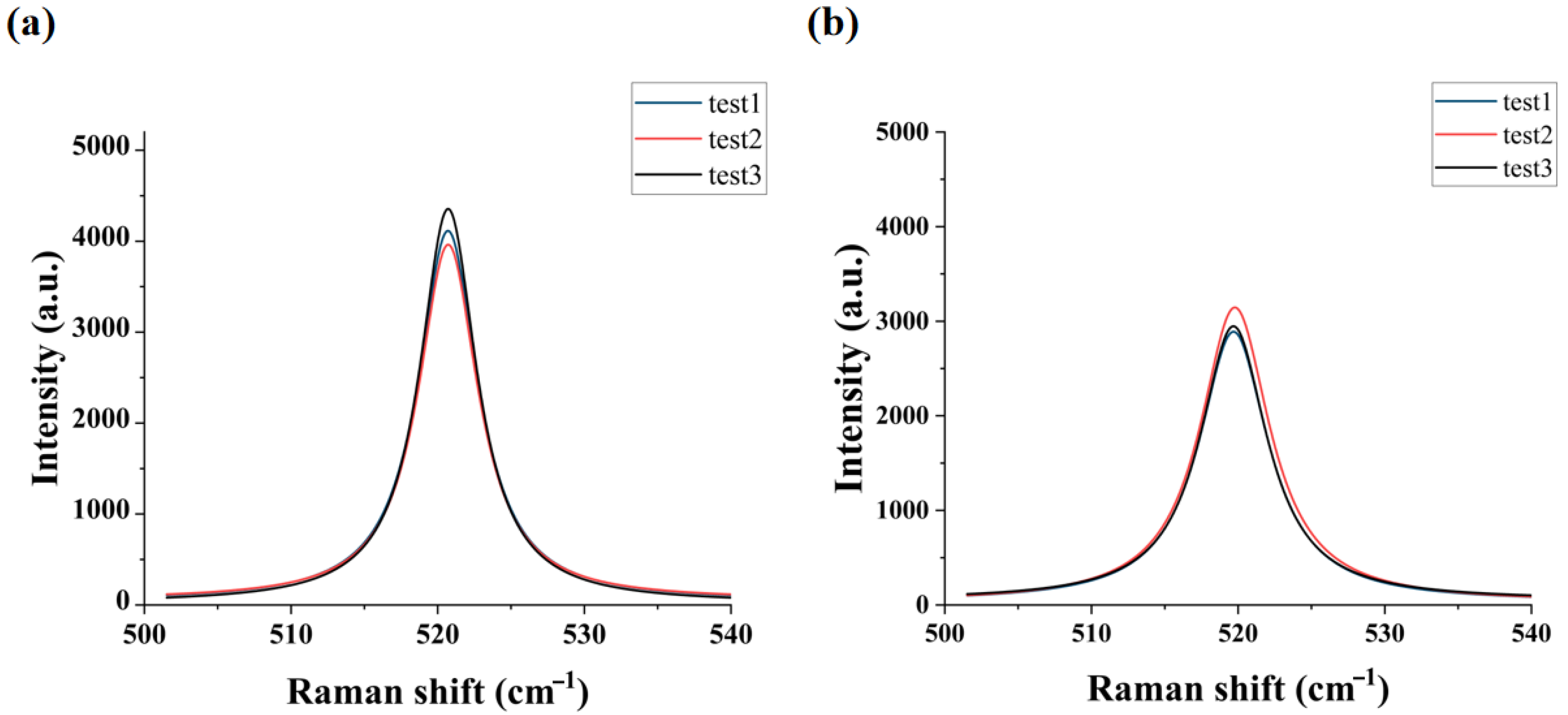 The correlation coefficient between the Raman shift and stress of the Si surface was calibrated via High-Resolution X-Ray Diffraction (HRXRD) technology. After calibration, they satisfy a linear functional relationship, with the specific expression [25,26]: