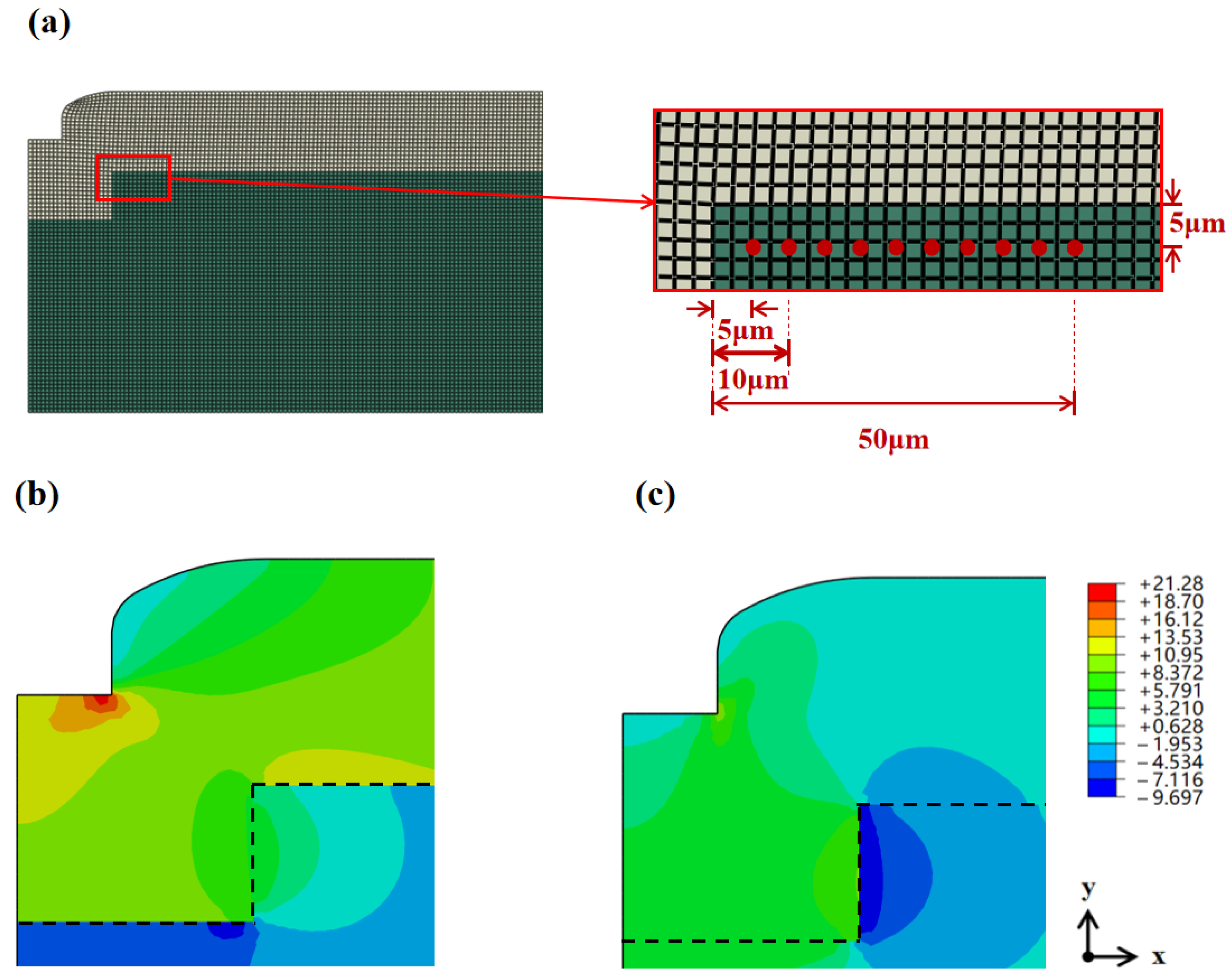 To further analyze thermal stress distribution, a finite element method (FEM) simulation model was established to simulate the gap filling structure in this study. A 2D axisymmetric model was built to analyze the stress under thermal loading. The material parameters used in the model are listed in Table 2. Figure 5a shows the geometric structure and mesh division of the model. This model focuses on thermal stress analysis of structures with a gap depth of 30 μm, width of 100 μm, and 50 μm thick SiO2 filler. Considering the localized characteristics of the model, Saint-Venant’s principle was applied for local modeling to simplify calculations while ensuring analysis accuracy of the core region.