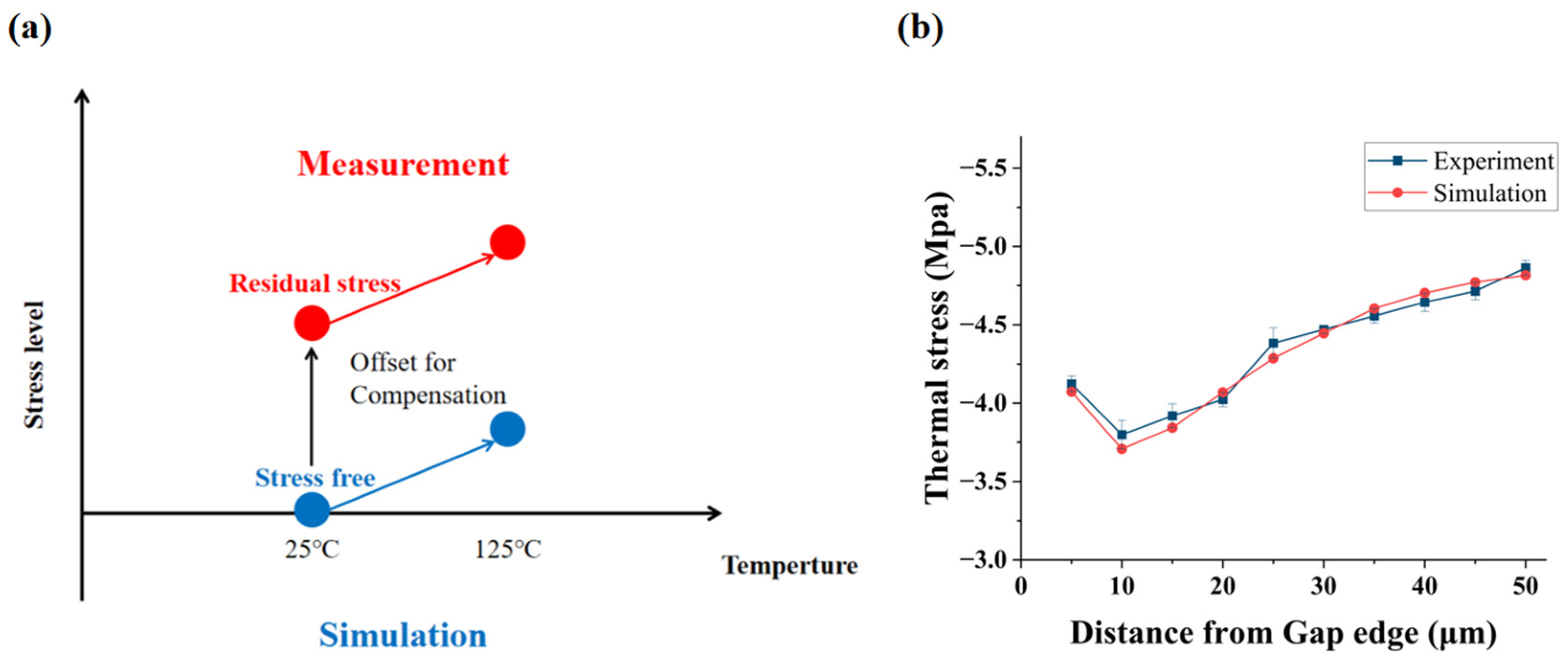 Figure 6. Comparison between FEM simulation and Raman measurement data for thermal stress of gap filling structure samples: (a) stress compensation scheme. Using the residual stress measured at room temperature (25 °C) as a compensation offset to eliminate the deviation caused by the “simulation assumption of zero stress at room temperature”, enabling stress data matching between 25 °C and 125 °C. (b) Comparison of in-plane biaxial stress between simulation and measurement data.