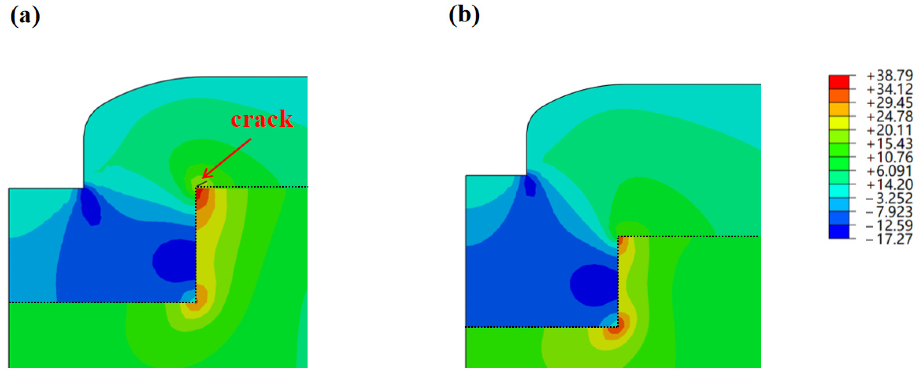 Figure 7a,b present the maximum principal stress distributions in the models featuring a 100 μm wide and 50 μm deep gap, with 30 μm thick and 50 μm thick filling layers deposited inside, respectively, after cooling to room temperature. The CTE of SiO2 is much lower than that of Si. During cooling, the Si substrate shrinks much more significantly than the SiO2 filling layer does. This results in deformation constraints at the interface between the two materials. At this point, the in-plane normal stresses in different directions generated by the shrinkage mismatch cannot be freely released and thus convert into shear stress at the interface. This leads to stress concentration of S12 at the upper corner of the gap, which, in turn, makes this location a stress concentration point for the maximum principal tensile stress. Simulation results indicate that, for the model with a 30 μm thick filling layer, the maximum principal stress at the upper corner of the gap edge first exceeds the critical value and, therefore, cracks are initiated at this location. However, when the filling layer thickness is 50 μm, the maximum principal stress of the model is lower than that of the model with a 30 μm thick filling layer. Meanwhile, the maximum principal stress in the 50 μm thick filling layer is also lower than the material maximum initial damage stress, so no cracks are generated. This is because a greater amount of SiO2 filling layer in the gap results in greater compression, which causes S11 (compressive stress component) to exhibit a larger magnitude while reducing the magnitude of S12. This leads to a decrease in the maximum principal stress of the model with a 50 μm thick filling layer. This indicates that the model with the 50 μm thick filling layer exhibits higher thermomechanical reliability relative to the one with the 30 μm thick filling layer.