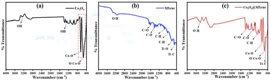 FTIR spectra of (a) Co3O4, (b) MXene, (c) Co3O4@ MXene nanomaterials.