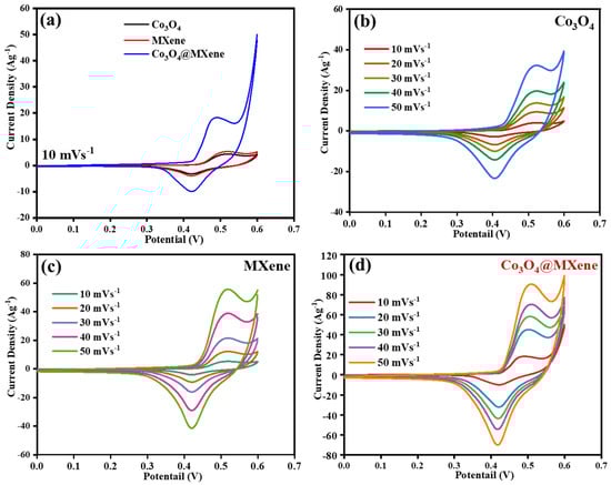 Cyclic voltammetry of: (a) Co3O4@ MXene, Co3O4 and MXene at 10 mVs−1, CV profiles of (b) Co3O4 (c) MXene and (d) Co3O4@ MXene at 10–50 mVs−1.