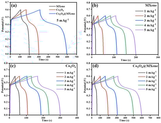 Galvanostatic charging/discharging curves of: (a) Co3O4@ MXene, Co3O4 and MXene at 5 mAg−1, GCD profiles of (b) MXene (c) Co3O4 and (d) Co3O4@ MXene at current density of 1–5 mAg−1.