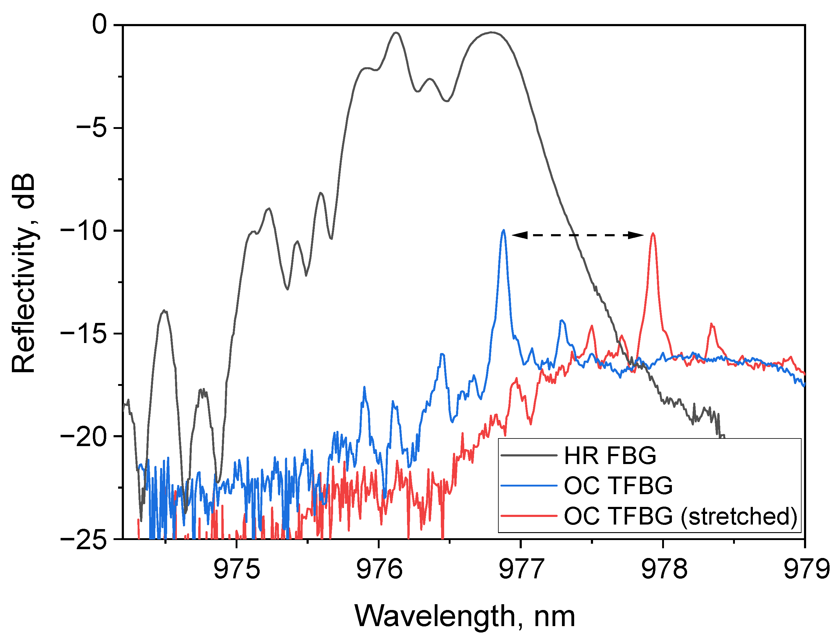 2. Due to broadband reflection of the mirror, electro-mechanical stretching of the FBG enables the tuning of the lasing wavelength from 972.7 to 979.1 nm (6.4 nm range) [