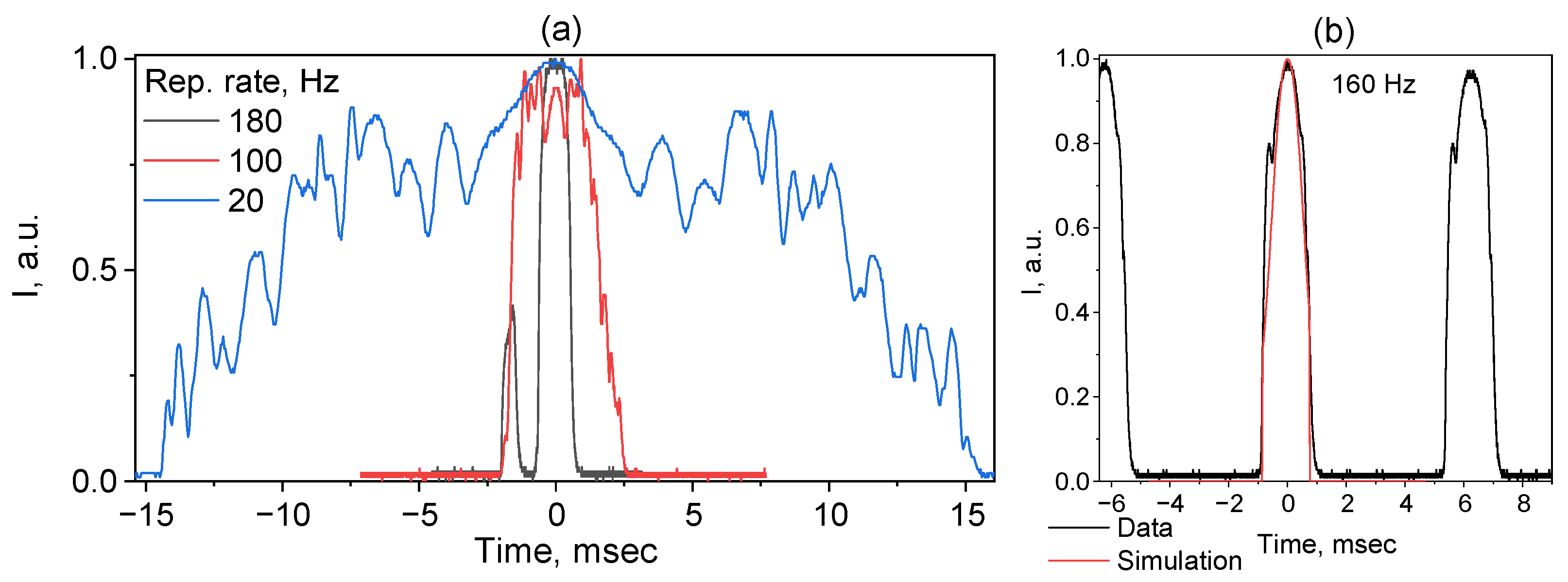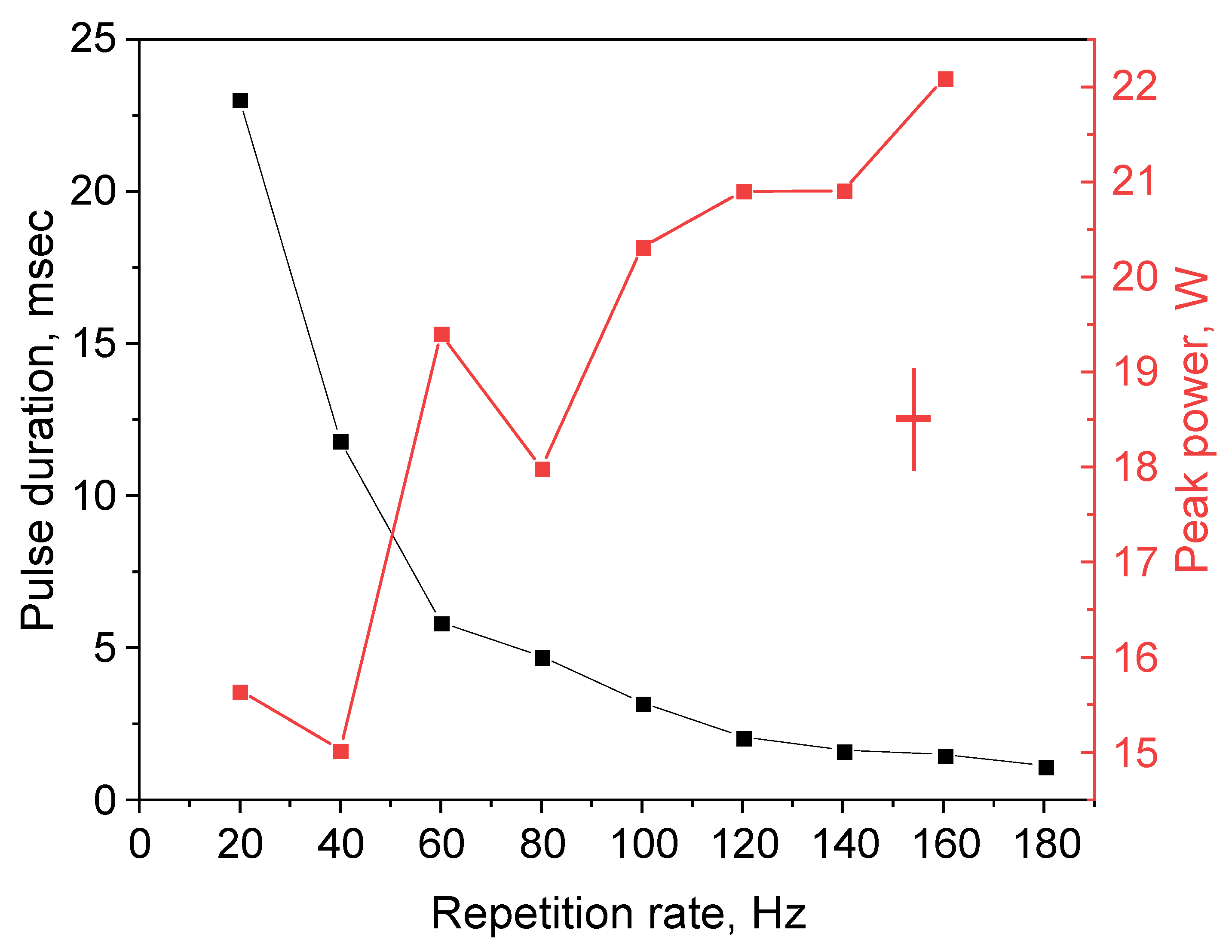 Figure 5 shows the dependence of the pulse duration on the repetition rate, as well as the corresponding peak power calculated from the average power and pulse duration. With increased repetition rate, the pulse duration decreases from ~23 ms to 1.2 ms, and the peak power increases from ~15 to 22 W when the repetition rate changes in the range 20–180 Hz.