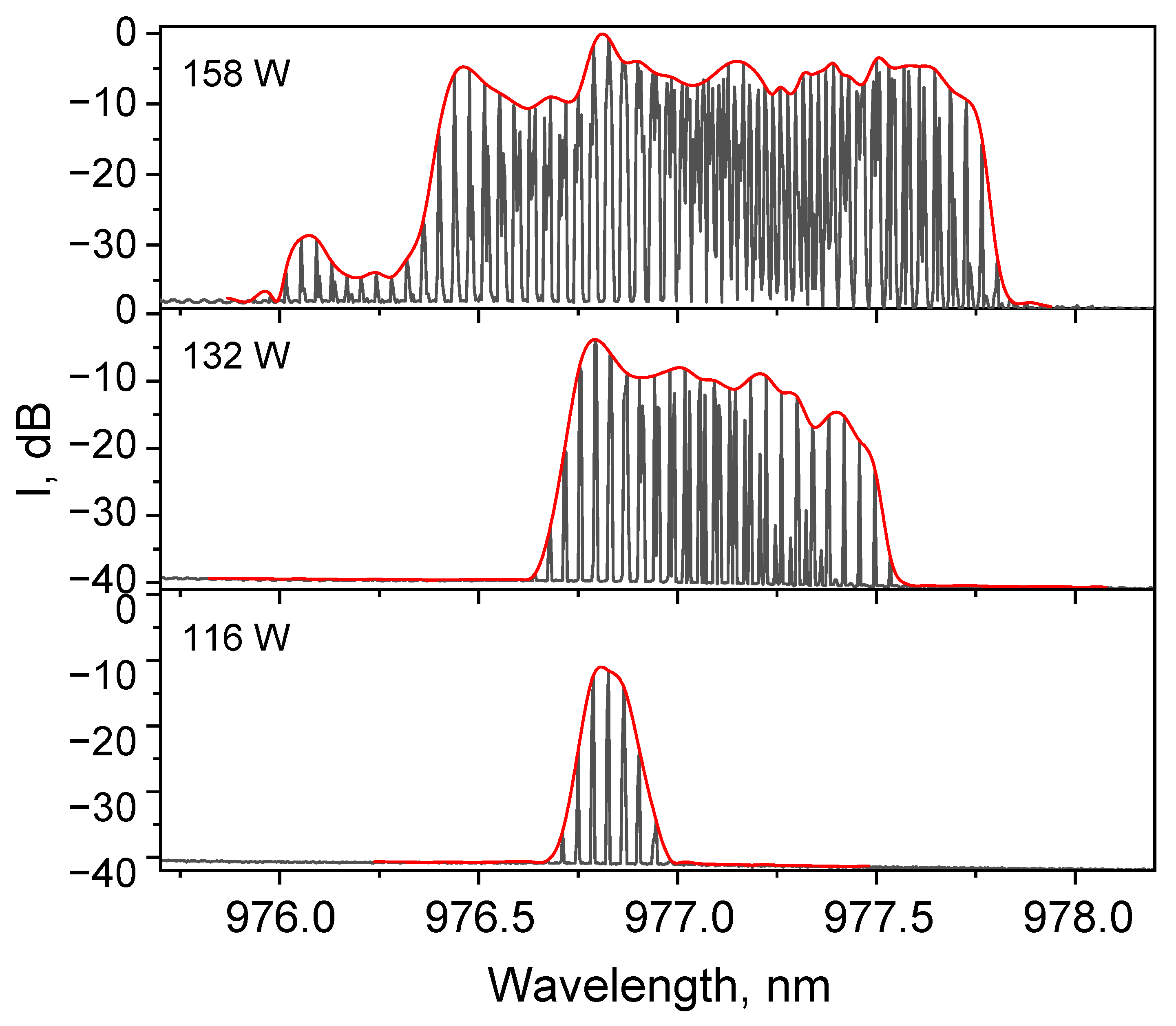 Figure 2). At the maximum pumping of 158 W, the lasing spectrum occupies the entire working range of the FBG modulation from 976.8 to almost 978 nm and extends even more in the short-wavelength part (to about 976 nm), so that the chirp rate value can be estimated as 0.7 nm/ms. With further increases in pump power, the gain at 978 nm (the reflection wavelength of the stretched OC TFBG) becomes higher than the loss, meaning lasing is not fully interrupted at the FBG stretching. In this case, the pulsed mode is replaced by a continuous one with intensity modulation. So, to resume pulse generation at high pump power, the OC TFBG wavelength modulation range must be increased to >1 nm.