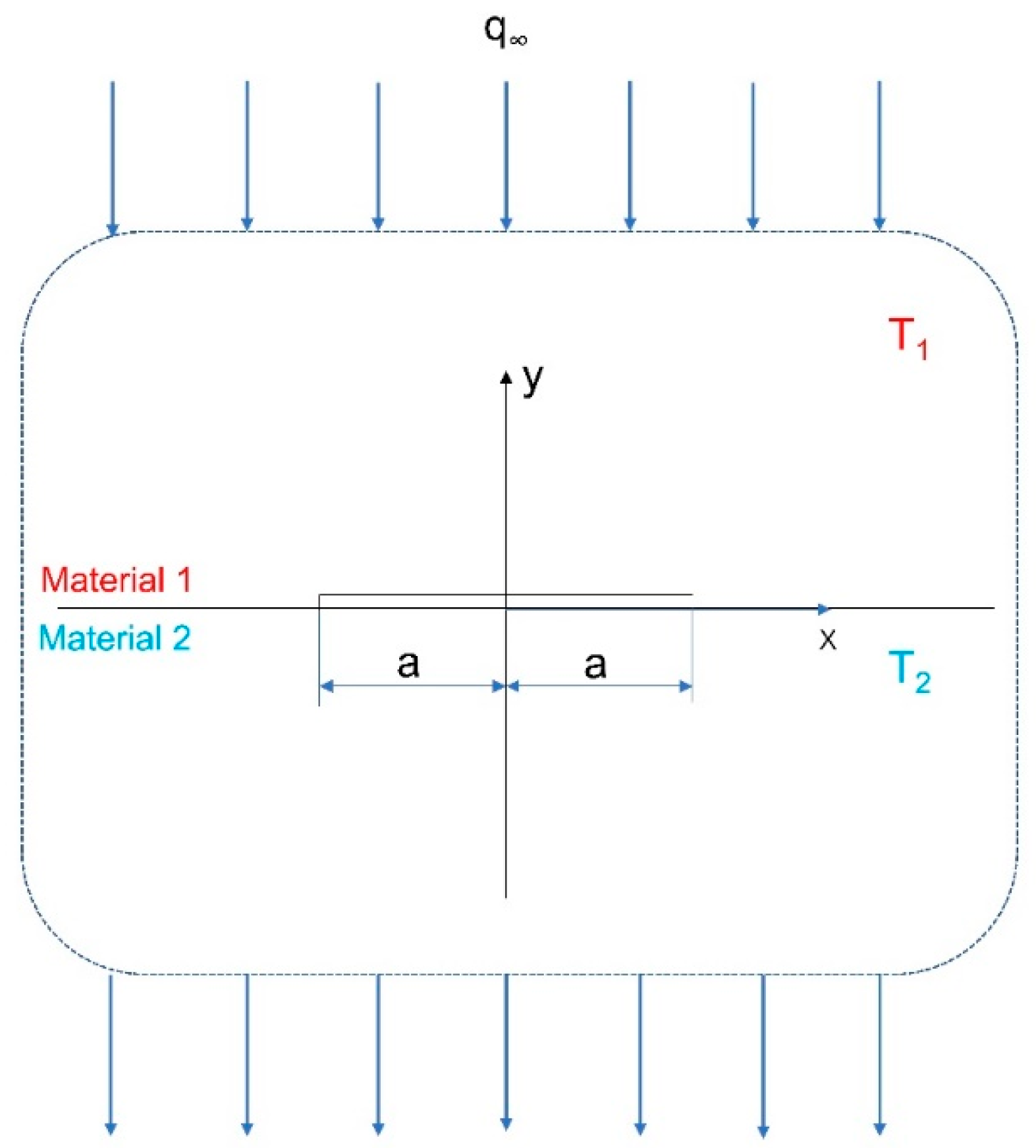 The theoretical model, schematically shown in Figure 1, is formulated for an adiabatic crack lying along the interface of two semi-infinite half-planes. The temperature distribution in this bi-material system is described by the functions Tj(x, y), where the index j = 1, 2 identifies the upper and lower half-planes, respectively. The boundary conditions for the temperature perturbation Tj(x, y) are specified as follows: