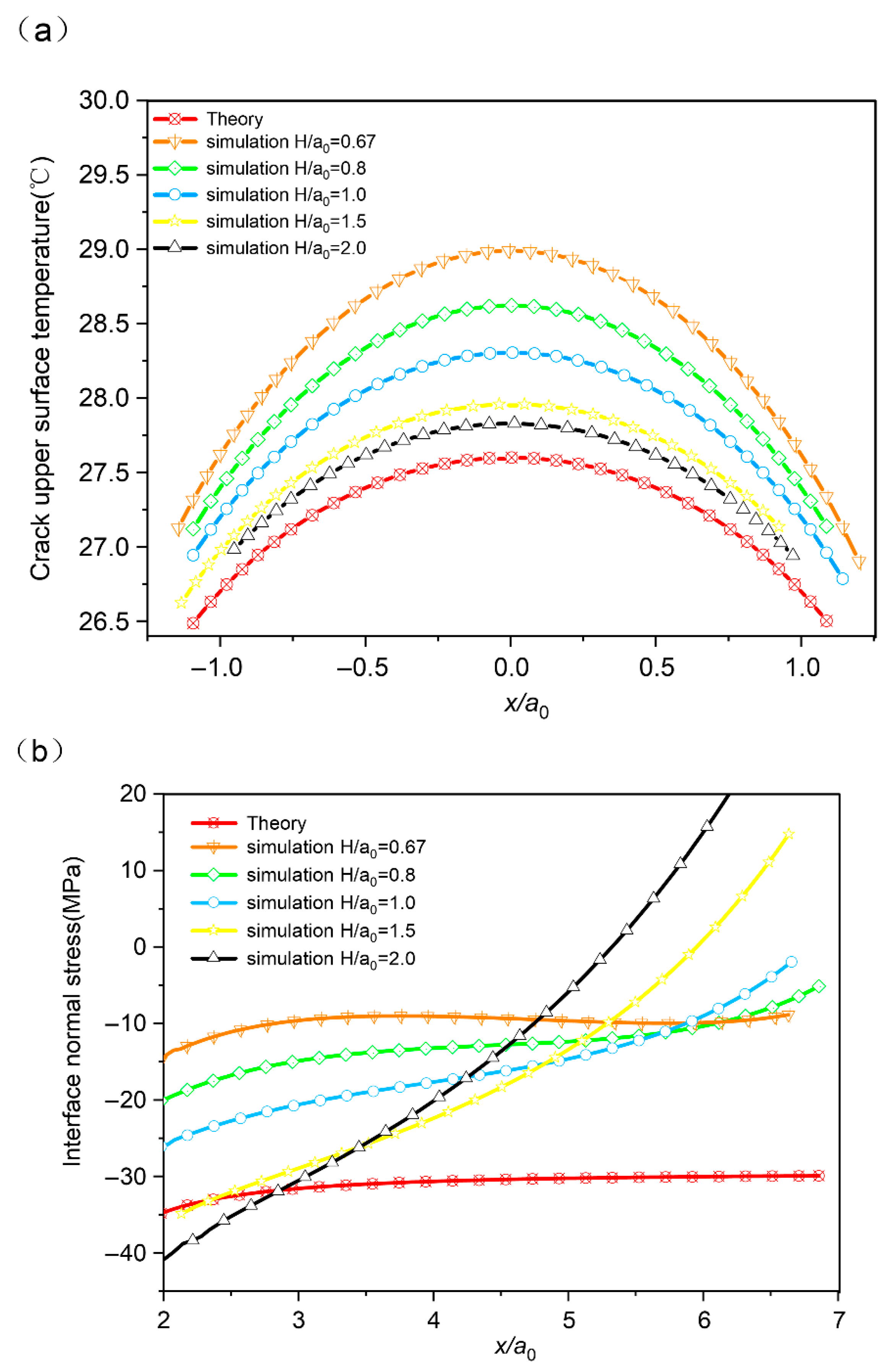 Leveraging the theoretical results of Section 2, we analyze the temperature fields for different dimensionless ratios of crack width to length (H/a0) and distance from the crack tip as x/a0, respectively. Figure 3a reveals a monotonic convergence of the upper-crack-surface temperature profiles toward the theoretical curve with an increasing value of H/a0, indicating that the thermal field evolves toward the semi-infinite plane solution. It can be foreseen that when the thickness–length ratio is big enough, the temperature distribution along the upper surface of the crack will be completely consistent with the theoretical curve. For H/a0 bigger than 0.8, the simulation results closely match the predictions of the theoretical model. Furthermore, the model’s validity is supported by its consistency with realistic operational conditions.