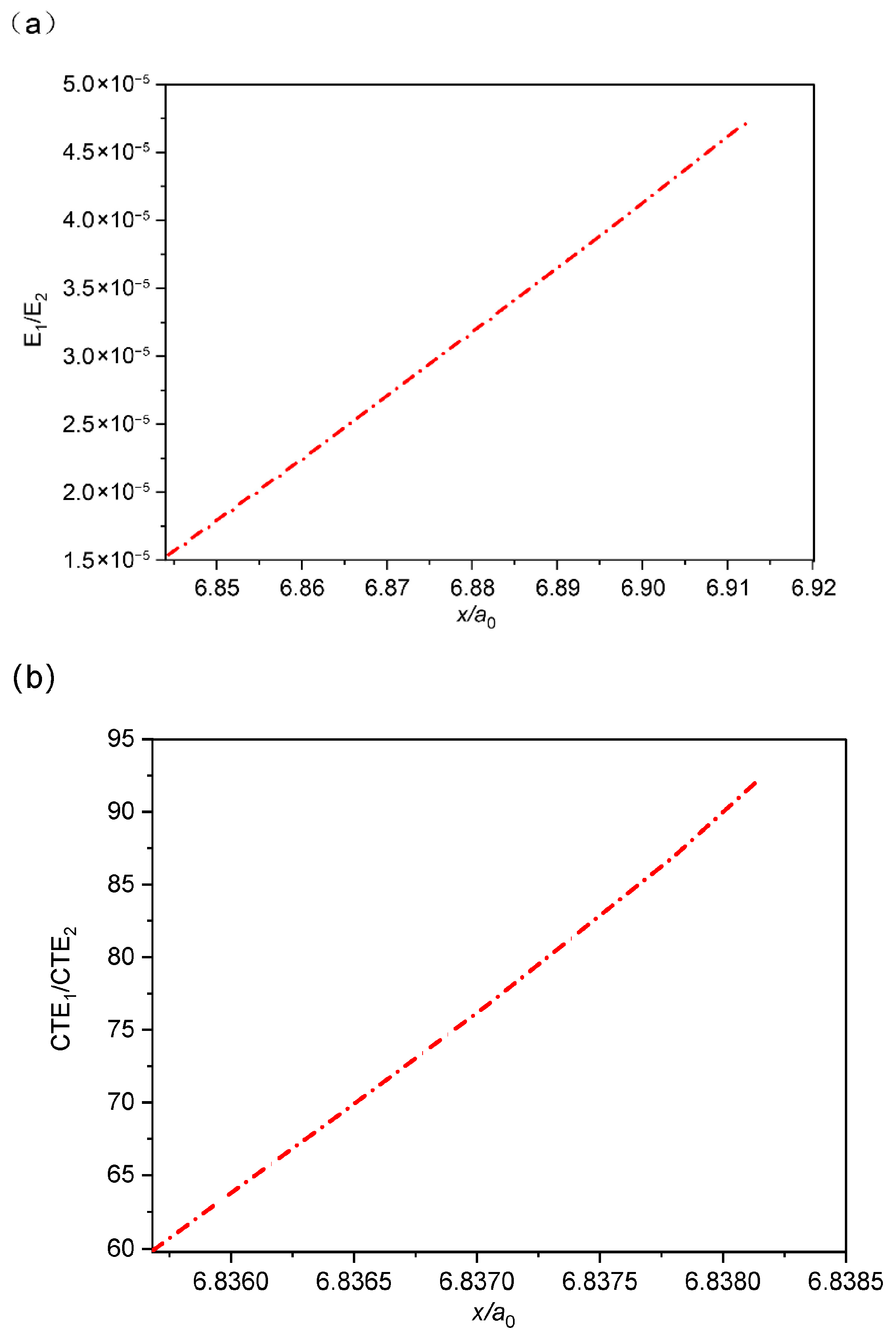 To better decouple the individual and combined effects of these two parameters, the following analysis focuses on the location along x/a0 where the interfacial normal stress reaches zero, referred to here as the “stress critical point”. For this purpose, we assume an ideal encapsulating material whose properties can be independently adjusted. Figure 5 illustrates the relationship between the maximum stress and the ratio of thermal expansion coefficients (or elastic moduli). The results indicate that when E1/E2 is held constant, the stress critical point increases linearly with CTE1/CTE2. Similarly, when CTE1/CTE2 is fixed, E1/E2 also shows a linear positive correlation with the critical stress point.