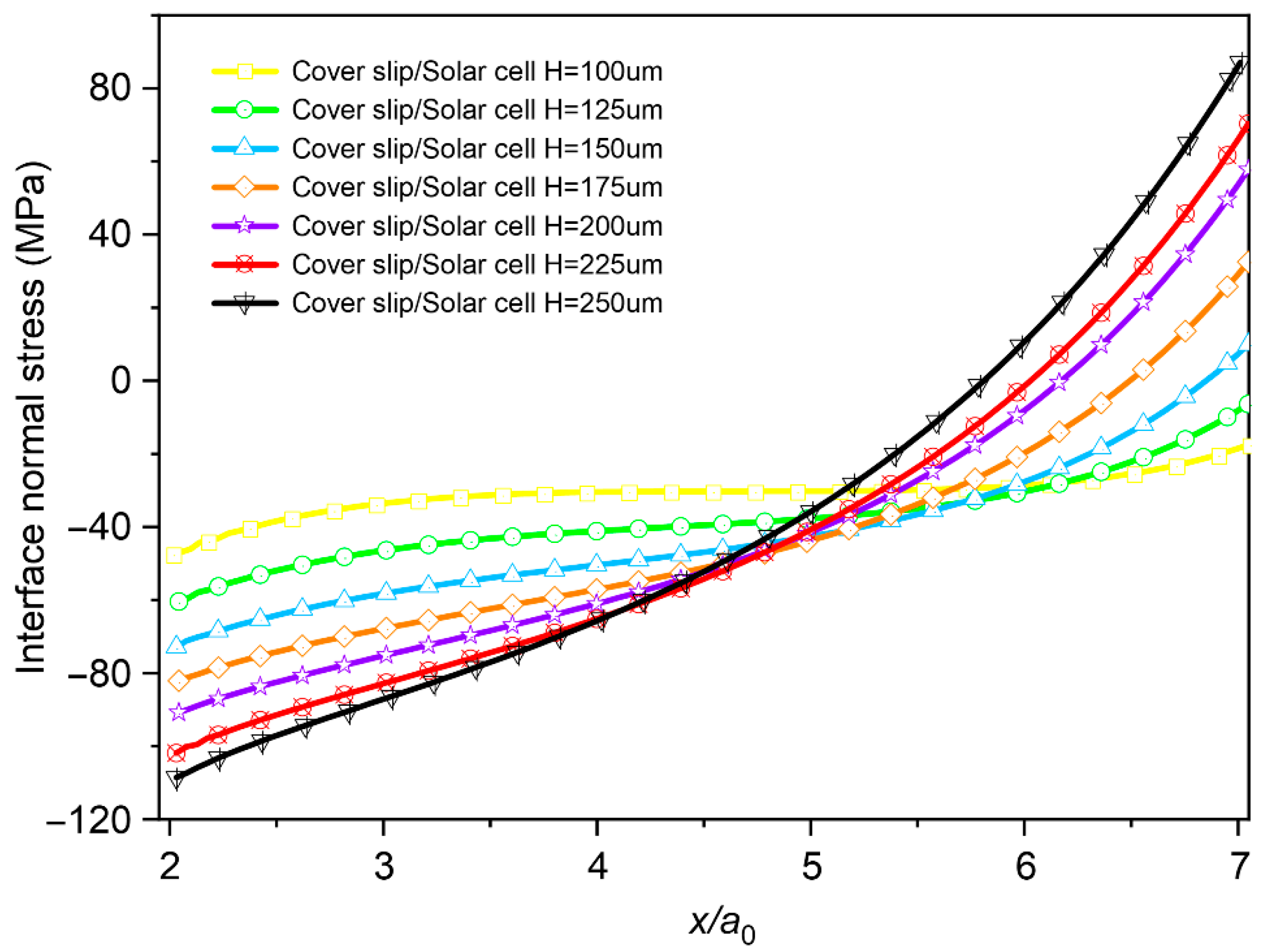 Finally, the influence of layer thickness is examined. In actual production, the thickness of the cover slip or solar cell typically ranges from 100 μm to 300 μm. In the model shown in Figure 7, the solar cell thickness is fixed at 150 μm, while that of the cover slip varies between 100 μm and 250 μm. The results indicate that the interfacial normal stress initially decreases and then increases with the normalized distance x/a0. Moreover, the maximum interfacial normal stress shows a positive correlation with the thickness of the cover layer.