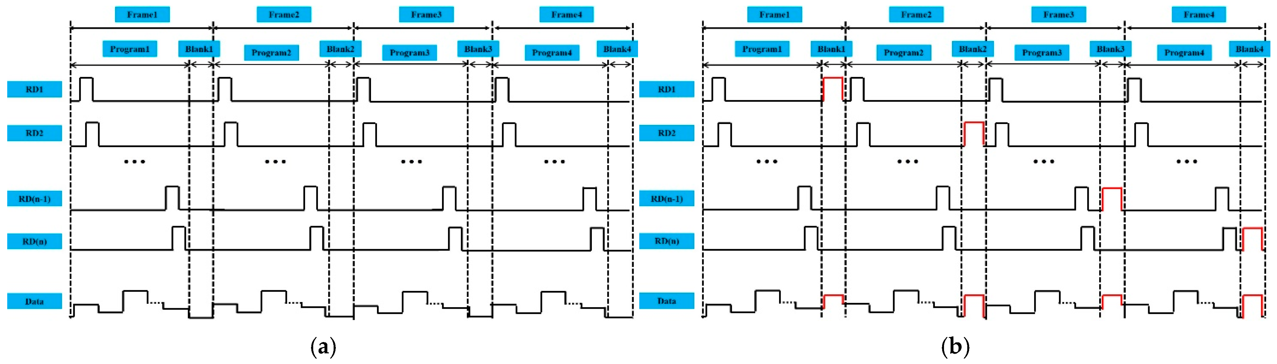 t (1.85 μs) denotes the charging time of each pixel, h (2160) denotes the number of rows on the display, and F (120 HZ) denotes the frequency. The blank time (170 μs) is calculated through the above formula and can be utilized to transmit closed captions, program rating information, time codes, and other data. The function of mobility compensation is to reduce the carrier mobility differences in TFTs in AMOLED pixels, thereby preventing the inconsistent light-emitting brightness among different pixels. The mobility compensation is performed during the blank time period to avoid affecting the effective display and ensure real-time compensation because these operations demand an independent timing window that does not interfere with the display.
