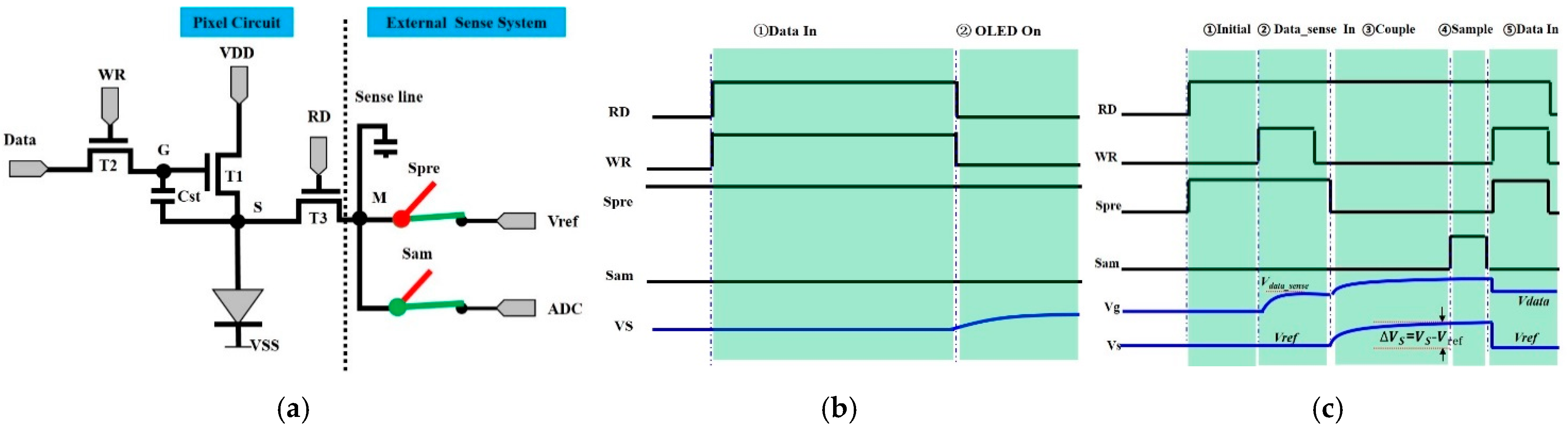 Figure 3a, and each pixel circuit is composed of two switching TFTs (T2, T3), a driving TFT (T1), and a storage capacitor (Cst). Two scan signals (WR, RD), generated by the GOA, are used to supply switching signals. Simultaneously, data voltage is utilized to control the gray scale in pixels. Furthermore, a high constant voltage (VDD, 24 V) and a low constant voltage (VSS, 0 V) are used to control the drain electrode voltage of T1 and the cathode voltage of OLED. The establishment of 3T1C circuit ensures that the mobility message of T1 can be detected by an external sense system. In this system, the anode of OLED, referred to as S in the circuit, connects to a source chip through the metallic sense lines on glass. Each of the Spre and Sam switches alternatively performed a turn-on operation and a turn-off operation in the source chips. The reference source (