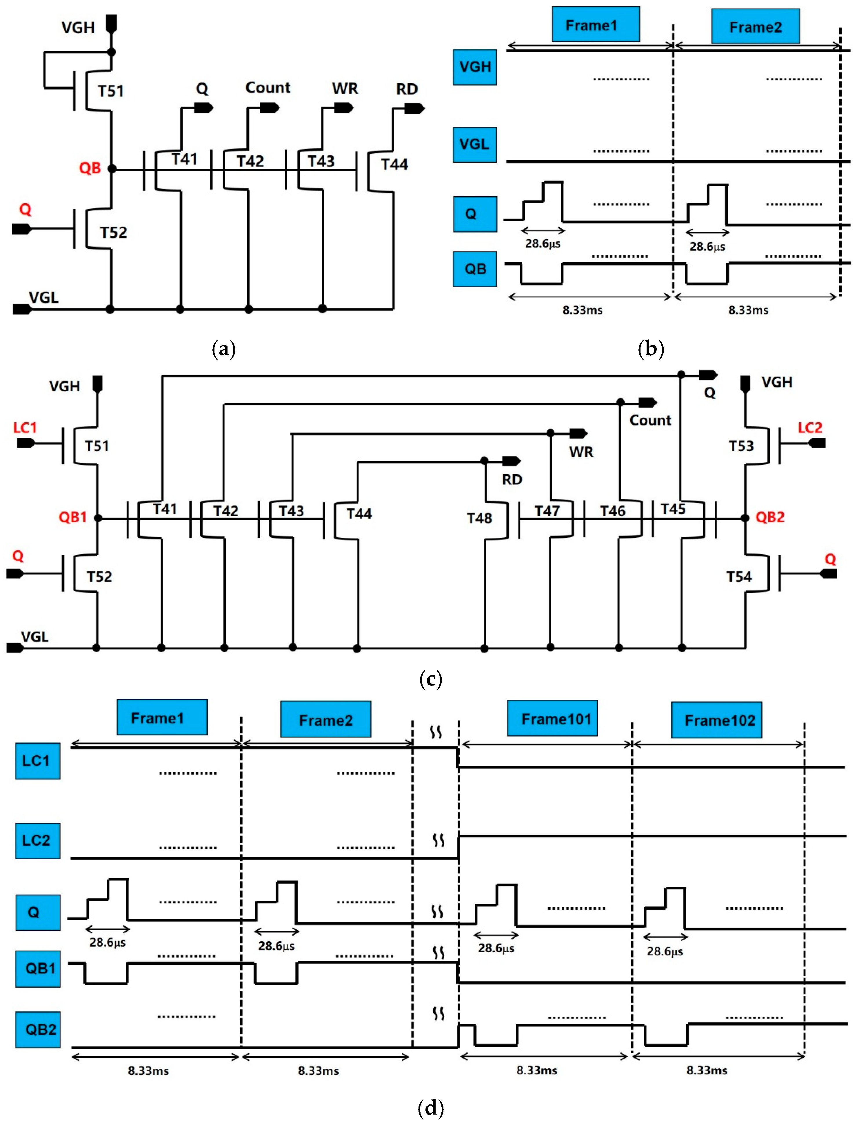 30]. Meanwhile, a dual low-voltage-level power (VGL) structure is used to reduce the leakage current from TFTs, which primarily serves to decrease the gate-to-source voltage (Vgs).
