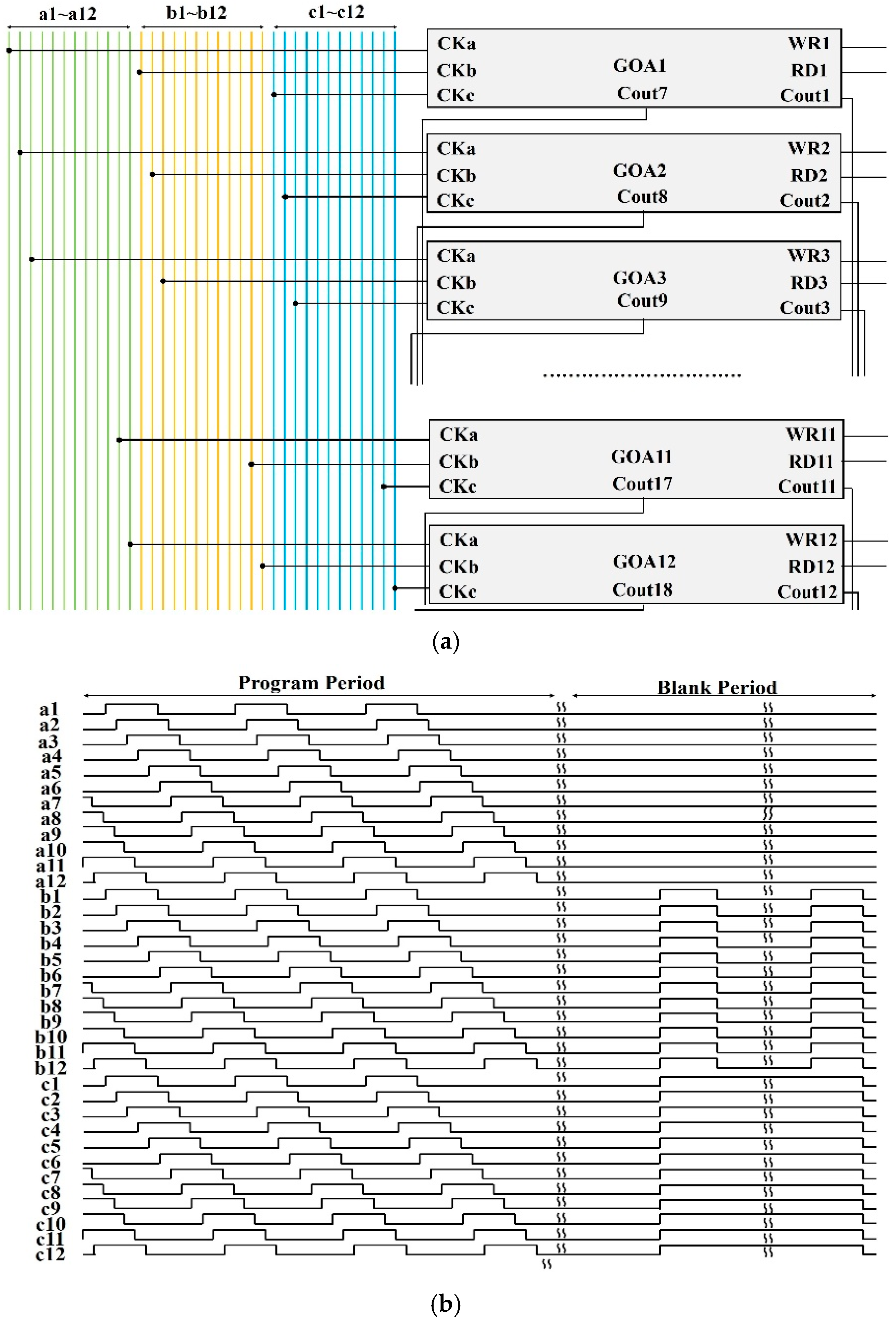 Figure 6a,b exhibit the GOA diagrams and the waveforms of CKs, respectively. Noteworthily, CK signals are relevant for the GOA circuits in two ways. At first, the increasing number of CK lines reduces the signal delay time in terms of the significant RC loading in displays with large sizes. More importantly, an overlapped structure in these CKs has been successfully developed to generate output waveforms in the GOA circuits with high quality. Considering the balance between RC loading and rise time, the pulse widths of CK signals are settled to 8.9 μs during the program time, and the GOA circuits are driven by 36 CKs (a1~a12, b1~b12, c1~c12), which are supplied by the bypass pins from external source chips. In this display, the whole GOA circuits are composed of 181 basic loop units (12 GOA stages in a basic unit). Furthermore, an additional unit (the 181th unit), the output of which must be disconnected from scan lines in the display area, is used to supply feedback signals for the 180th GOA unit. In addition, Cout(n − 6) signals in the first six stages are driven by the external start pulse.