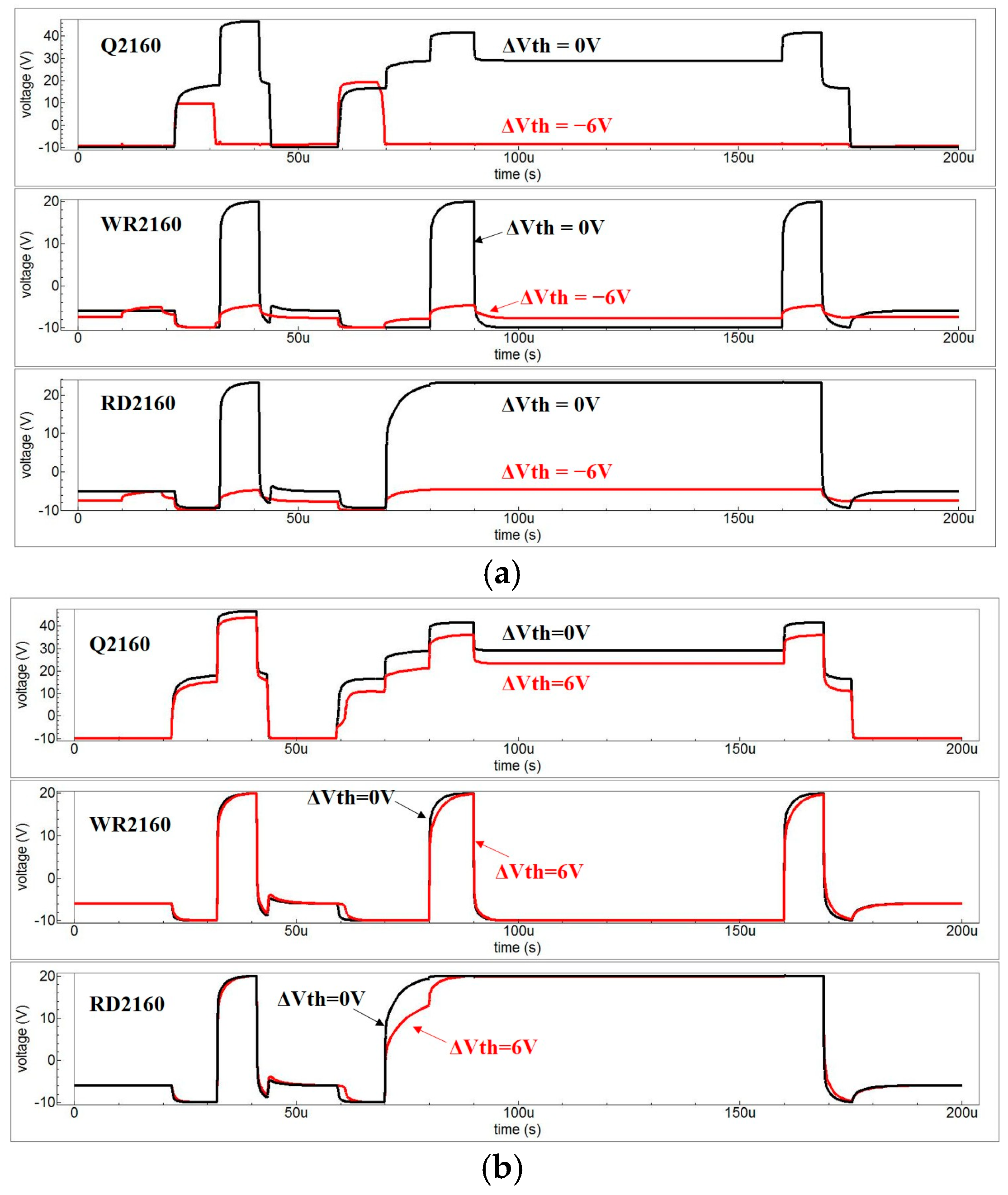 Figure 7a show the output waveform of the 2160th GOA stage, which is smooth and clear without any distortion. Moreover, the GOA exhibits good stability, which is confirmed by the output waveform when the threshold voltage in TFTs shifts to −5 V. Nevertheless, when Vth shifts by −6 V, the high voltage is released in Q and a malfunction takes place in the GOA. When Vth shifts by 6 V, the charging and discharging speeds decrease, resulting in the distortion of the output waveform, shown in