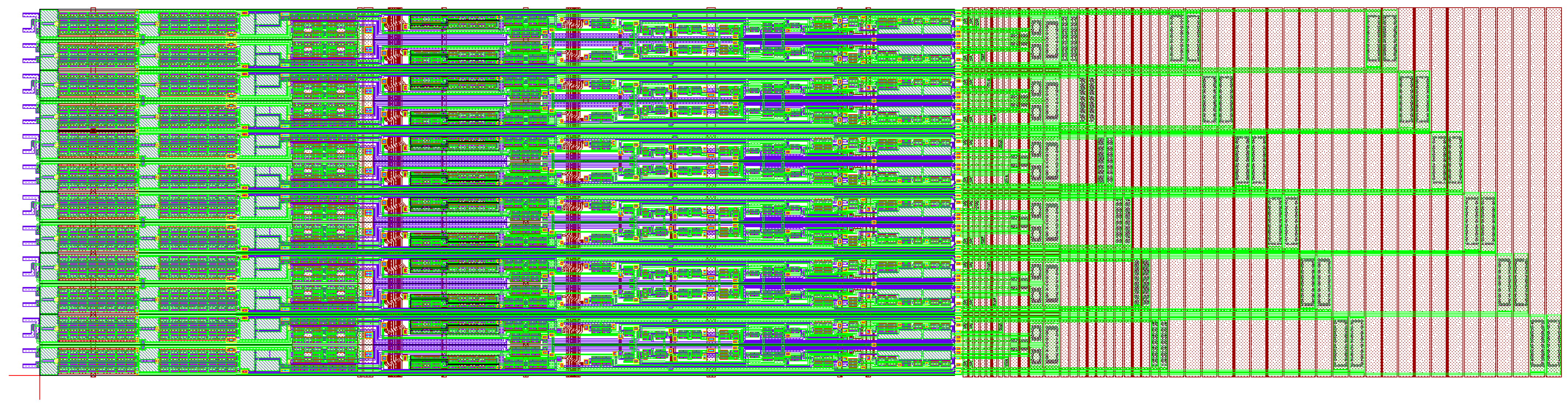 Figure 8 shows the layout of GOA with a width of 9.2 mm, which is fabricated through the top-emission AMOLED manufacturing process in a G4.5 experimental line. To investigate the GOA function, an oscilloscope was utilized to assess the output waveforms from the GOA, and its results are shown in