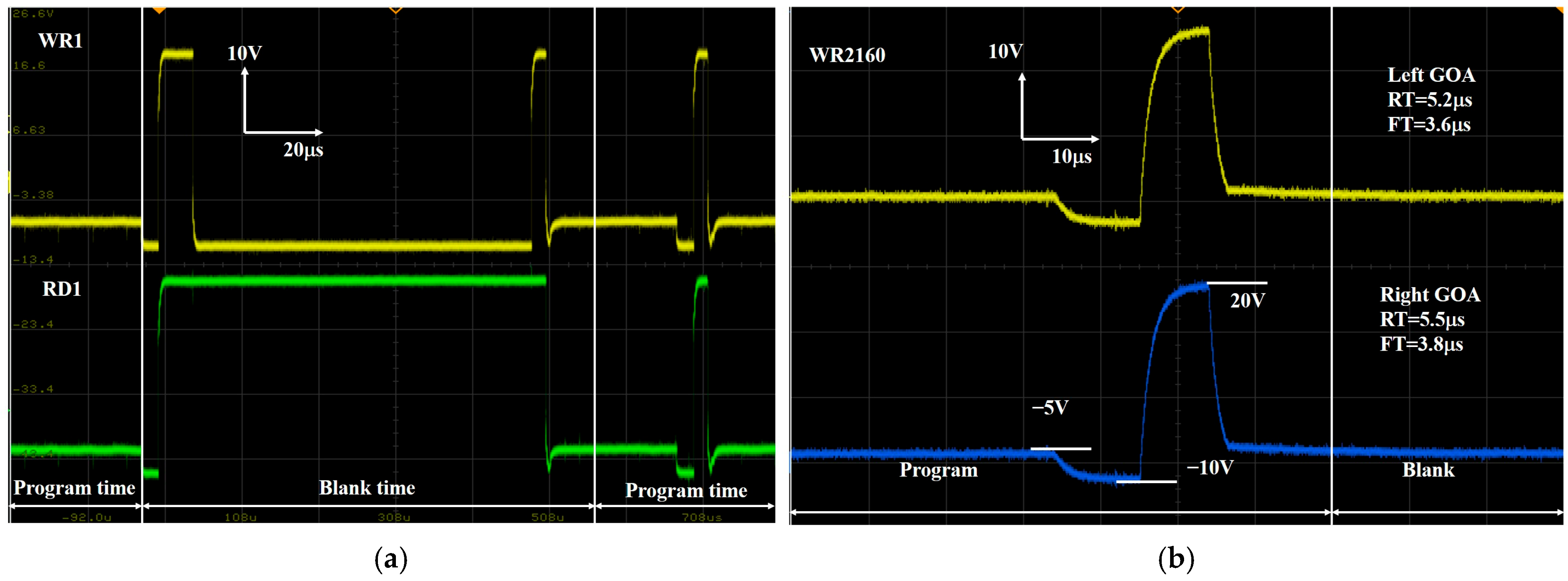 Figure 9b. The GOA yields rising time (RT) and falling time (FT) of 5.2 μs and 3.6 μs for the left side of the display and 5.5 μs and 3.8 μs for the right side, respectively. Theoretically, the charging rate is equal to the discharging rate for a stable signal source.