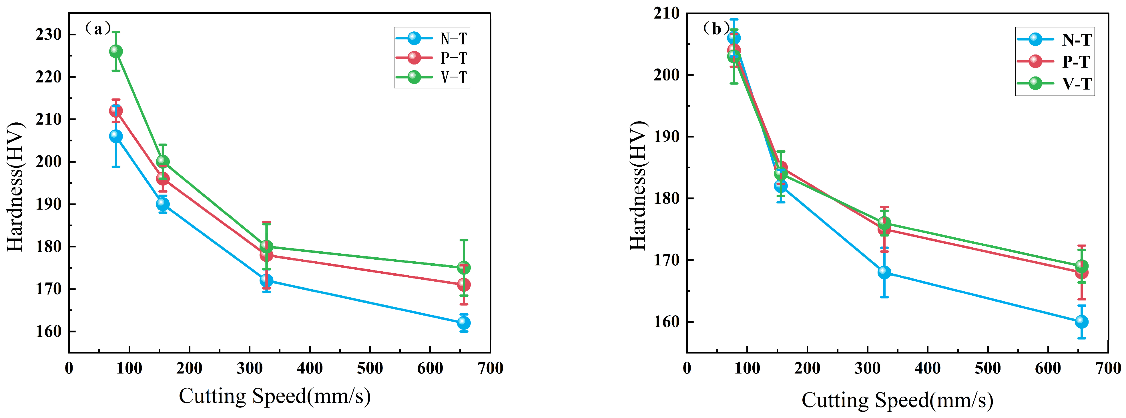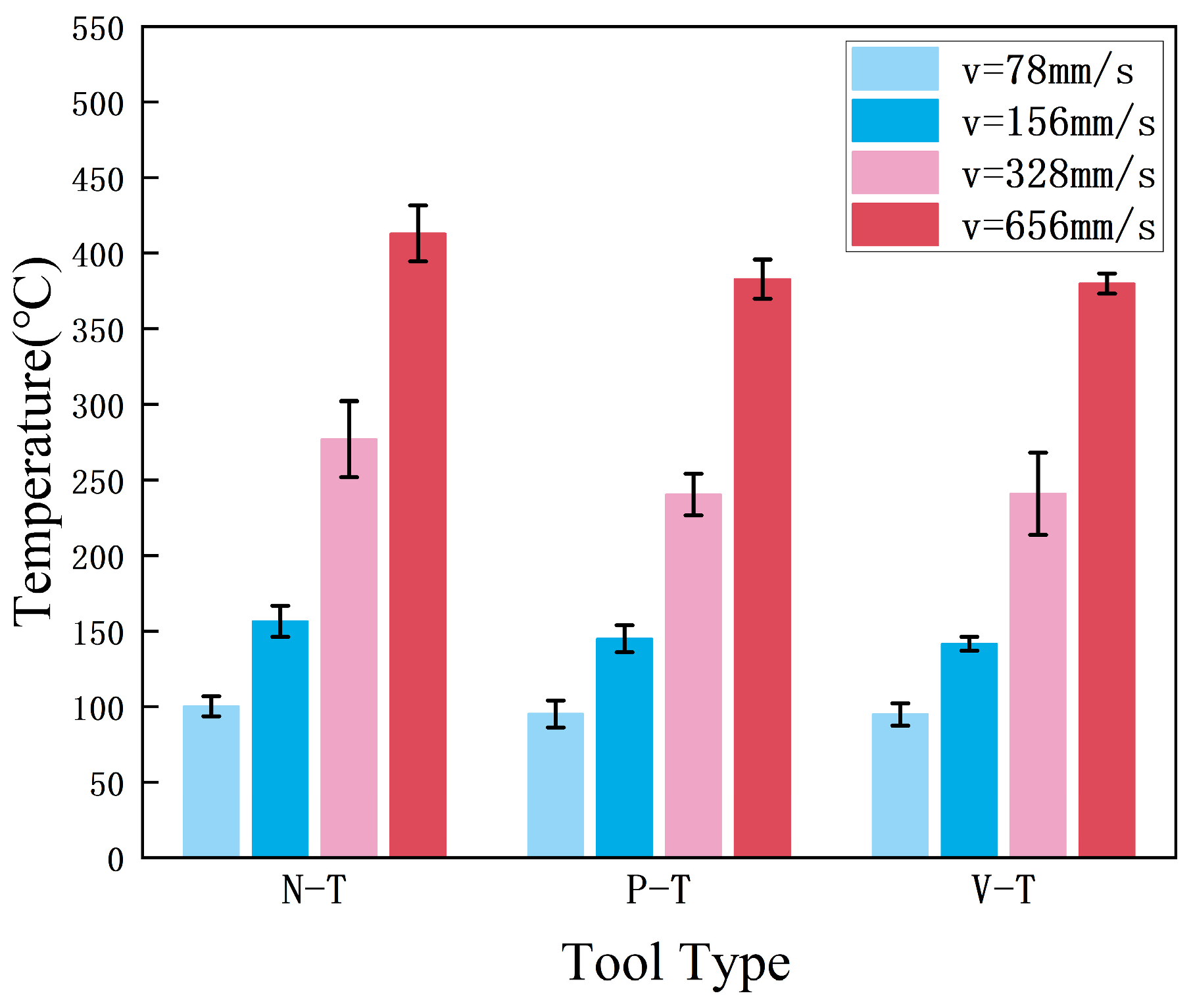 - Microtextured cutting tools effectively reduce cutting temperatures. Compared to N-T tools, P-T tools and V-T tools reduced maximum cutting temperatures by 8.22% (20.82 °C) and 8.97% (22.71 °C) on average, with maximum reductions of 13.20% (36.56 °C) and 13.02% (36.06 °C), respectively. Microtextures guide chip flow directionality, reducing adhesion time at the tool-chip interface while increasing the tool’s effective heat dissipation area. This enhances heat dissipation efficiency, thereby lowering cutting temperatures and reducing tool wear.