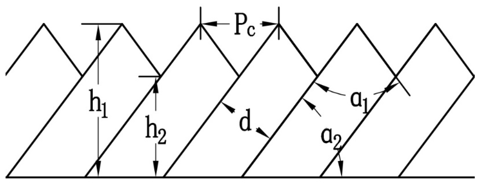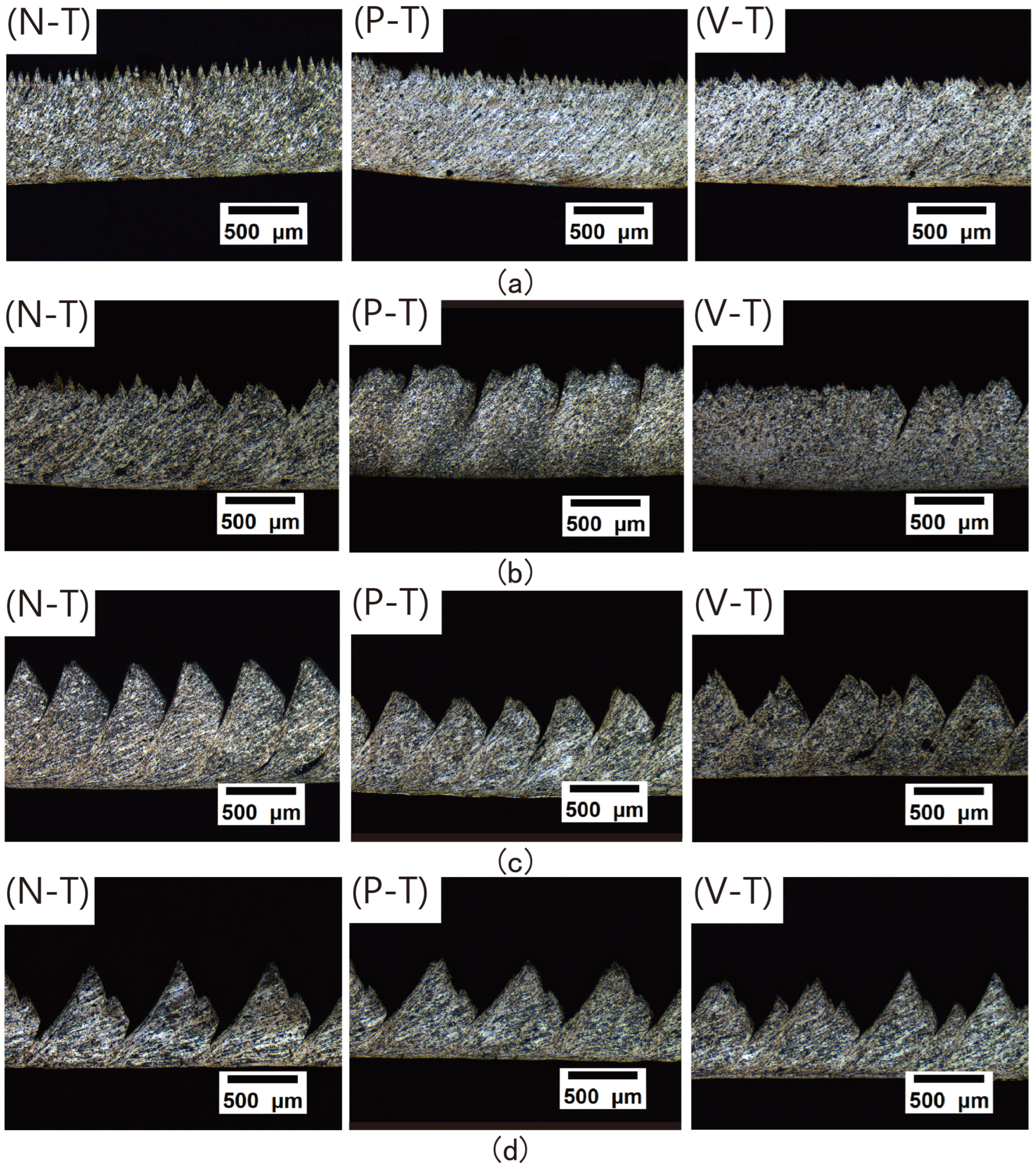 - Microtextured cutting tools suppress serrated chip formation. Under identical cutting conditions, chips produced by P-T and V-T tools exhibited lower serration ( ) than those from N-T tools (with maximum reductions of 11.51% and 25.66%, respectively). The increased serration spacing enhances chip formation stability, thereby improving machined surface quality.