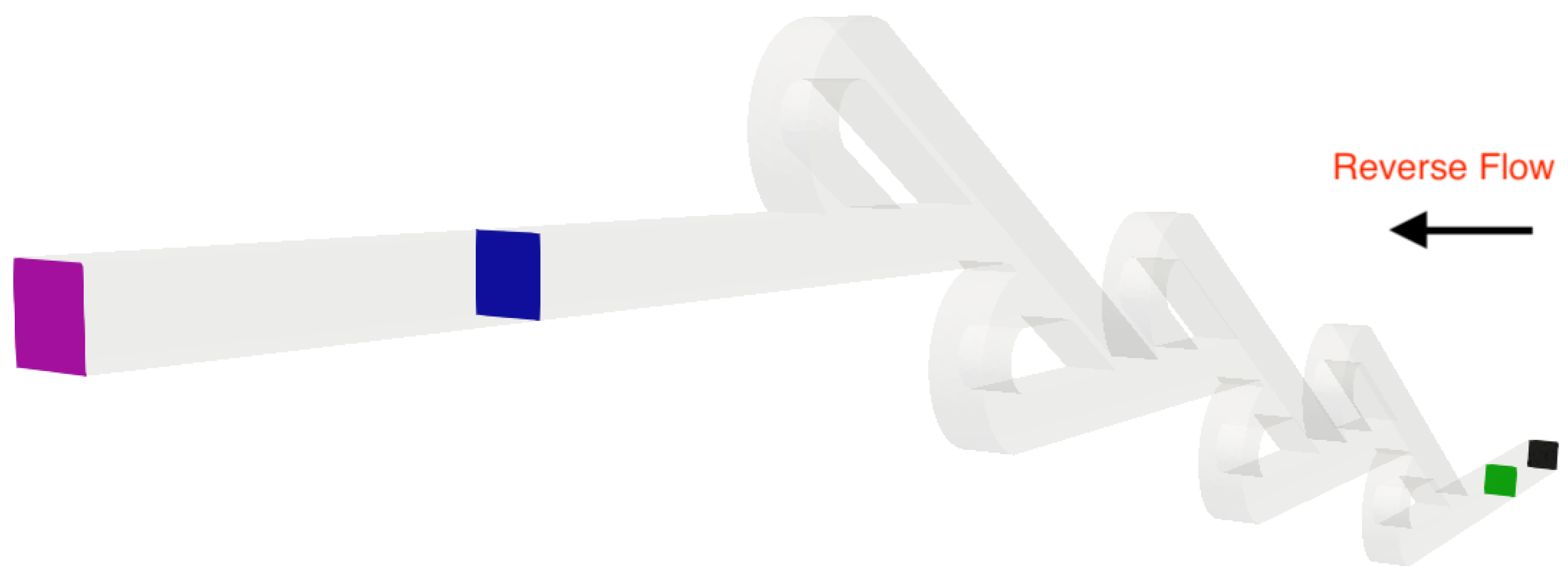 for the forward flow. Additionally, the entrance and exit lengths were extended by 1.2 mm in order to resolve any potential issues at the outlet boundary condition for the reverse flow [