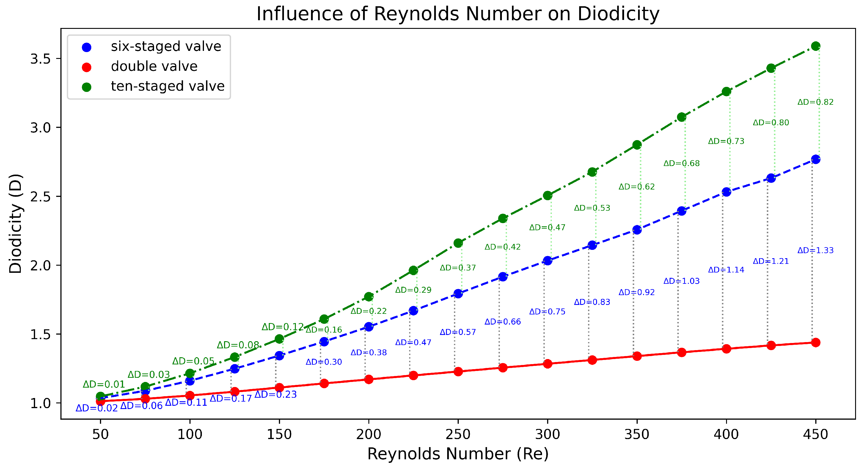 This progression demonstrates a clear reduction in diodicity enhancement per additional stage, indicating that, beyond a certain geometric complexity, the flow field saturates and additional loops contribute proportionally less to momentum redirection. In practical terms, this means that designers should avoid excessive staging, as the performance gain per added loop decreases rapidly while the fabrication cost and pressure losses continue to rise. At low Reynolds numbers (Re = 50), the incremental improvements are almost negligible, consistent with the dominance of viscous forces that suppress inertial flow separation mechanisms. For intermediate Reynolds numbers, all corresponding diodicity values across the valve configurations can be extracted from