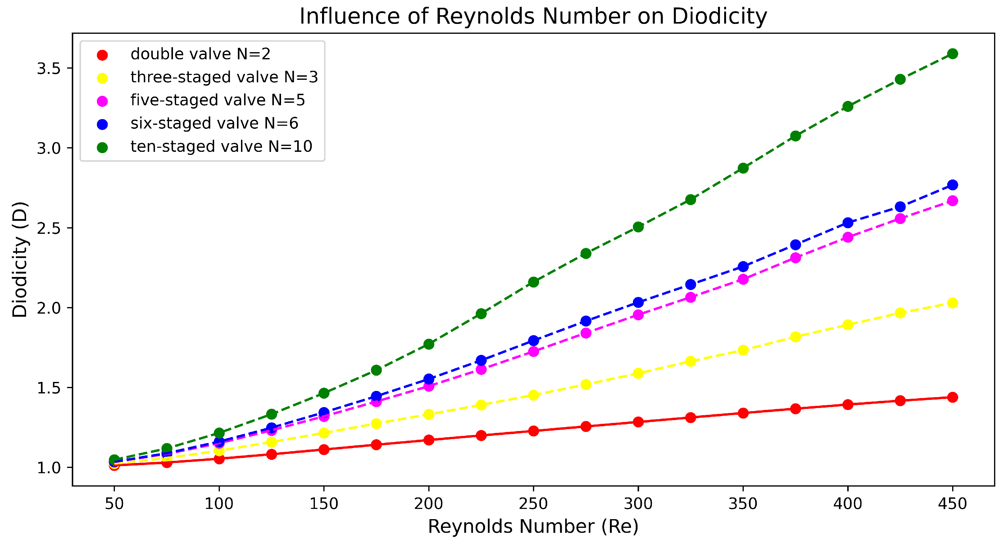 Moreover, when the number of valves was increased further, reaching up to the ten-staged valve, the increase in Re affected the diodicity, as in the previous cases. In