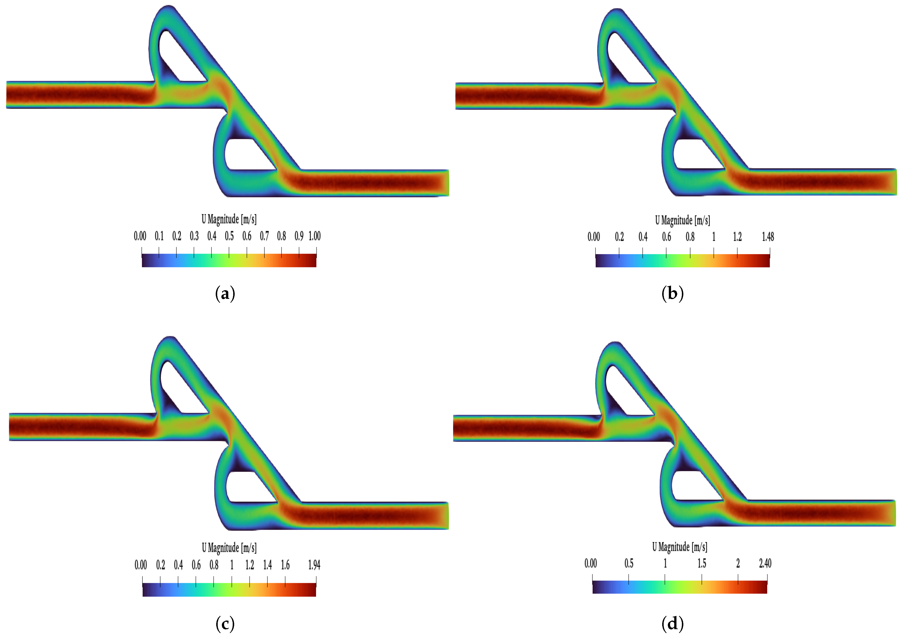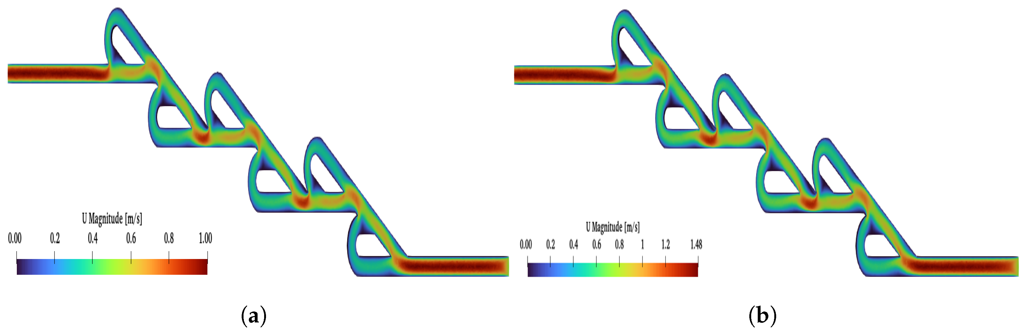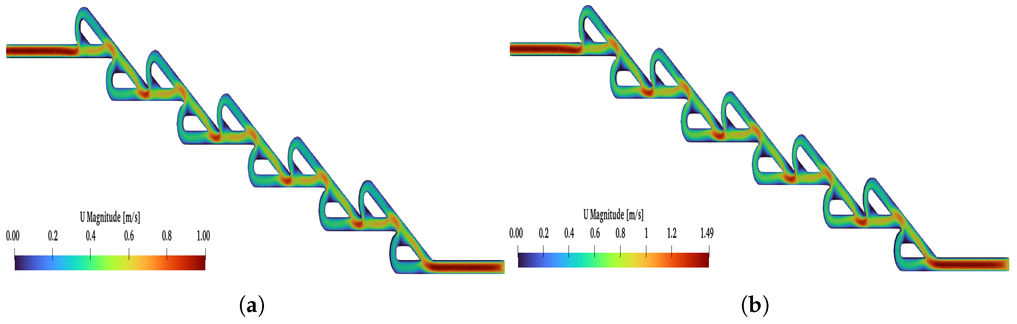 Moreover, all geometries and computational meshes were created using the open-source software GMSH (version 4.13.1). The simulations were performed with OpenFoam (version 10), which is also a free software platform. In these simulations, the velocity and pressure fields were obtained by employing a suitable solver that corresponded to the problem requirements. The solver was based on the Semi-Implicit Method for Pressure-Linked Equations (SIMPLE). The governing equations were the continuity (