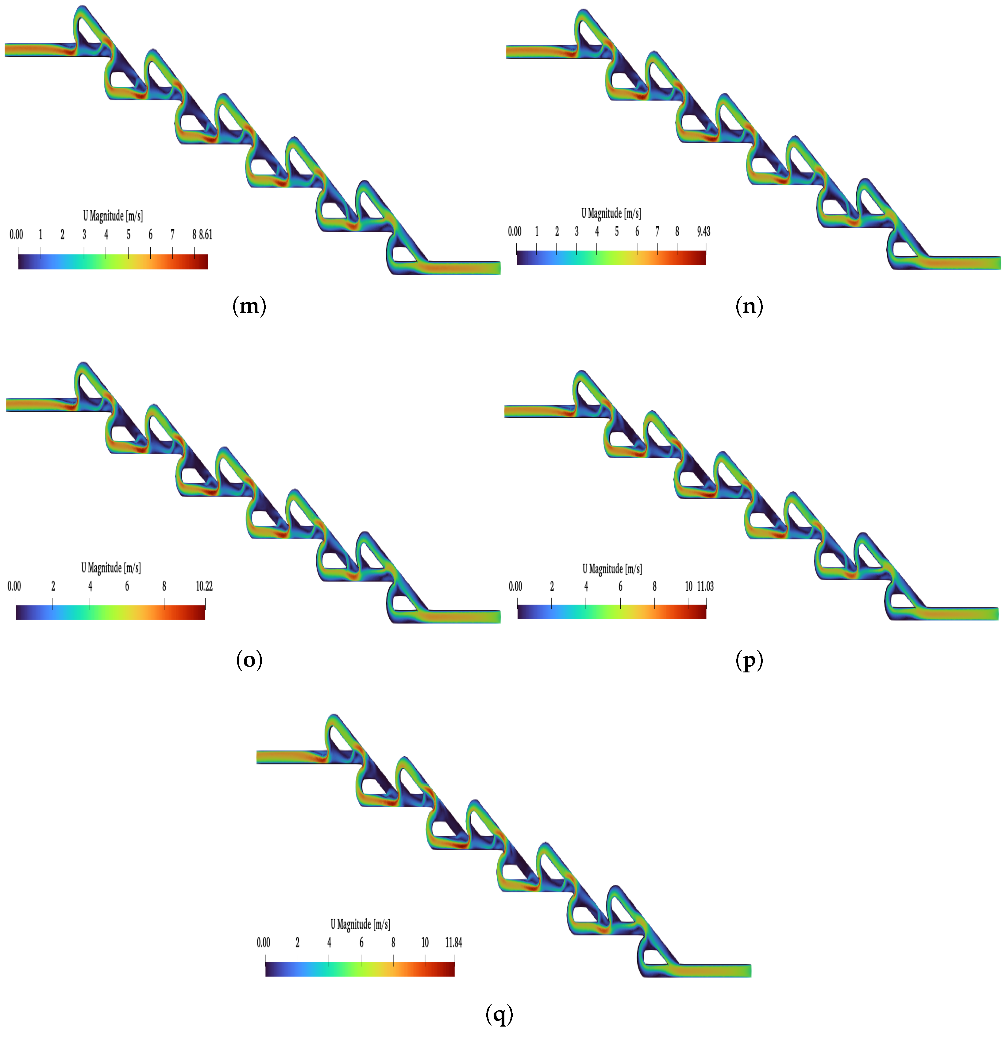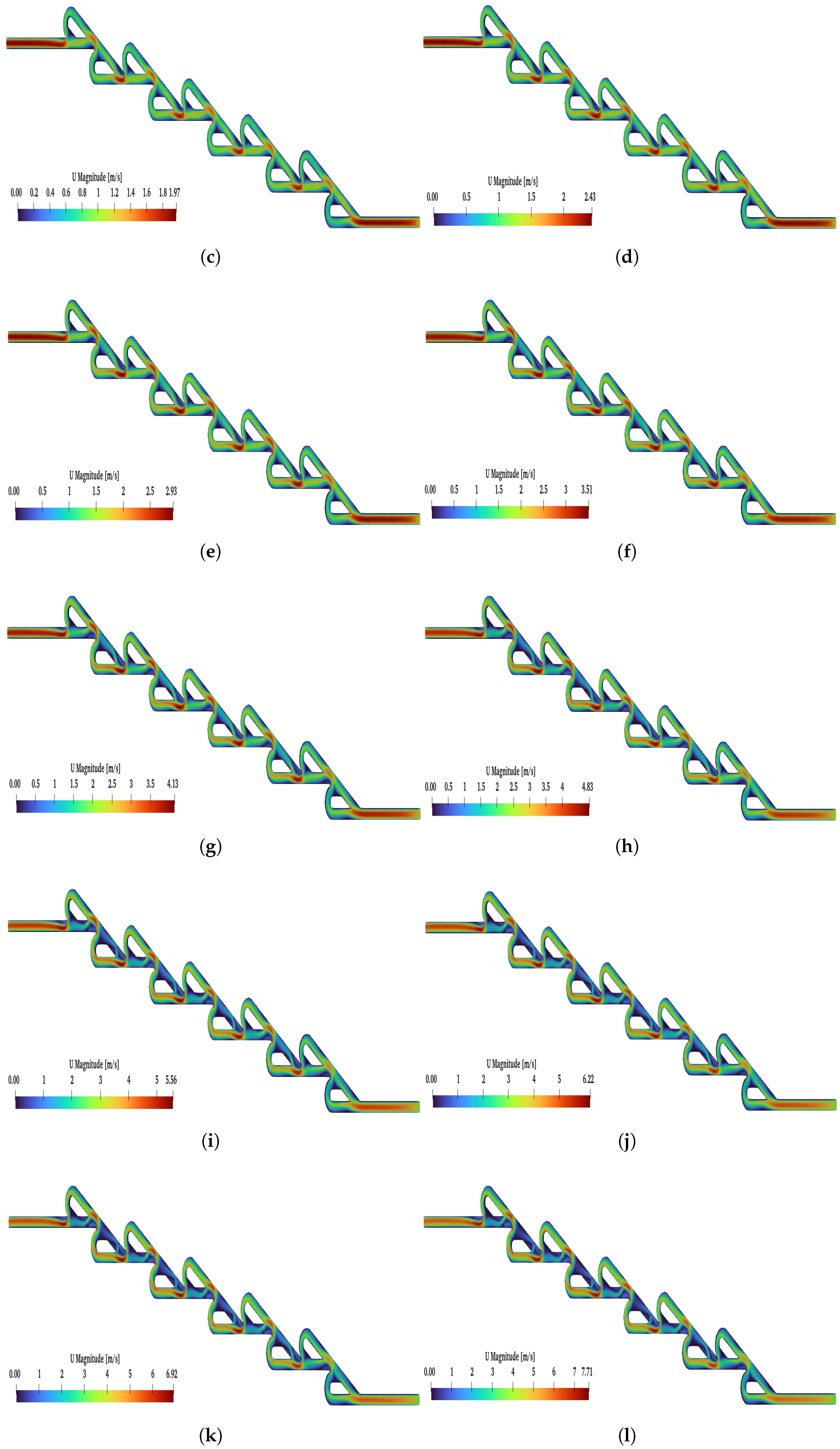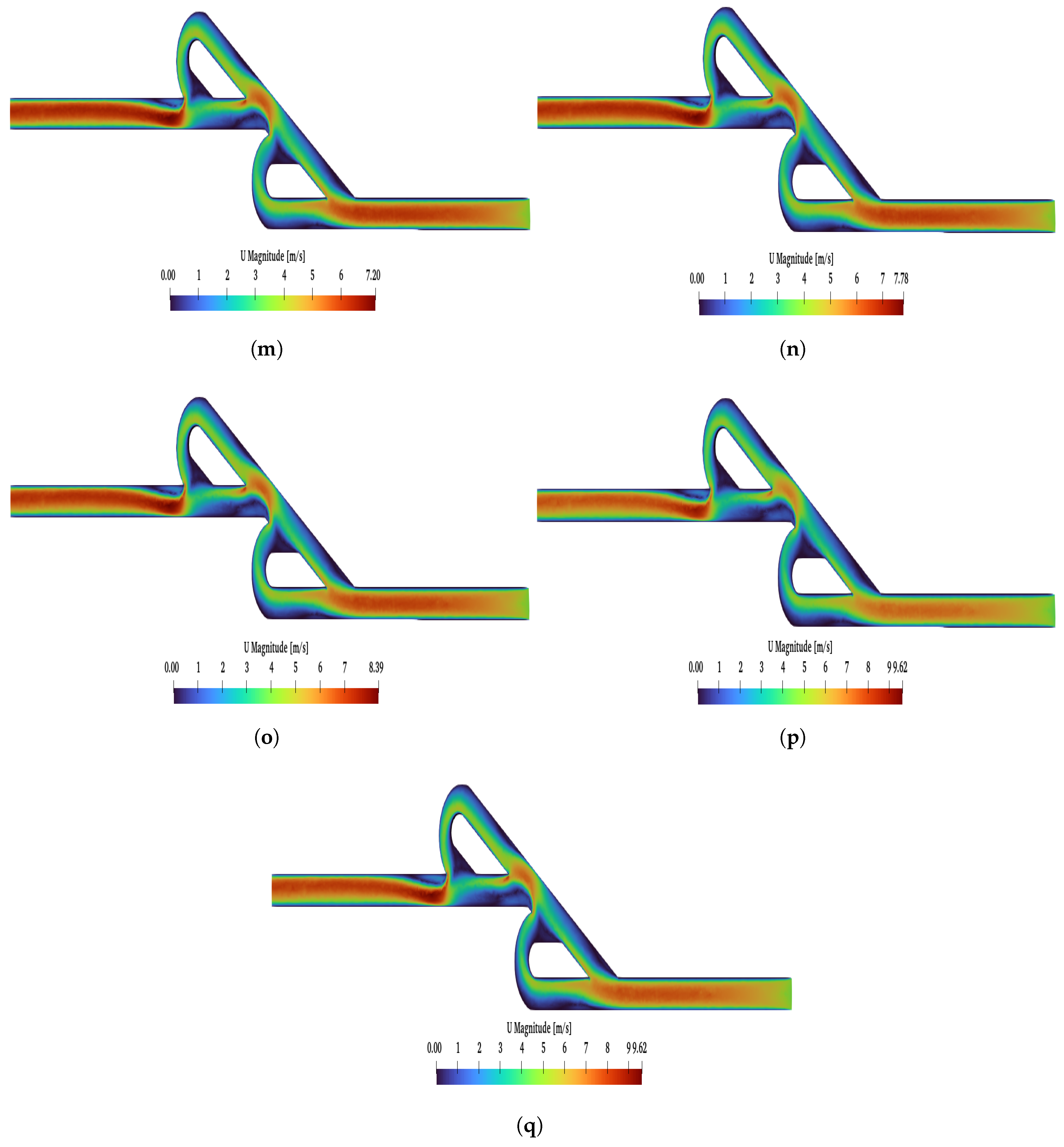 Table A1 was obtained, where the ranges of Re and Q are presented. In essence, Re varied from 50 to 450 in increments of 25, which indicated that the flow was laminar. The volumetric flow rate was used as an indicator for the potential applicability of the valve. The range of Q was from 5 to 45 with increments of 2.5 μL/s.