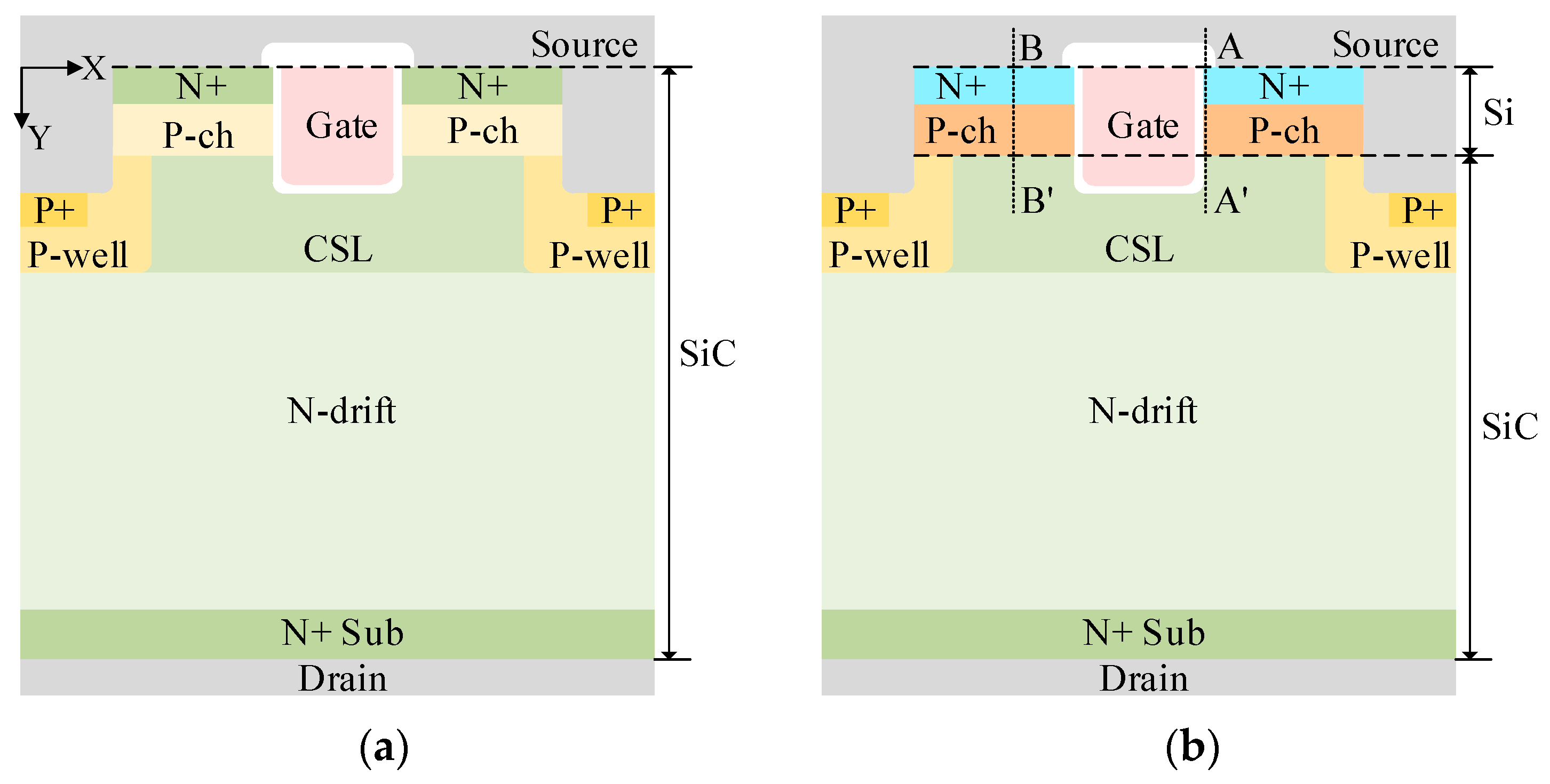 Figure 1. Schematic cross-section of (a) Con-DTMOS and (b) HJ-DTMOS.