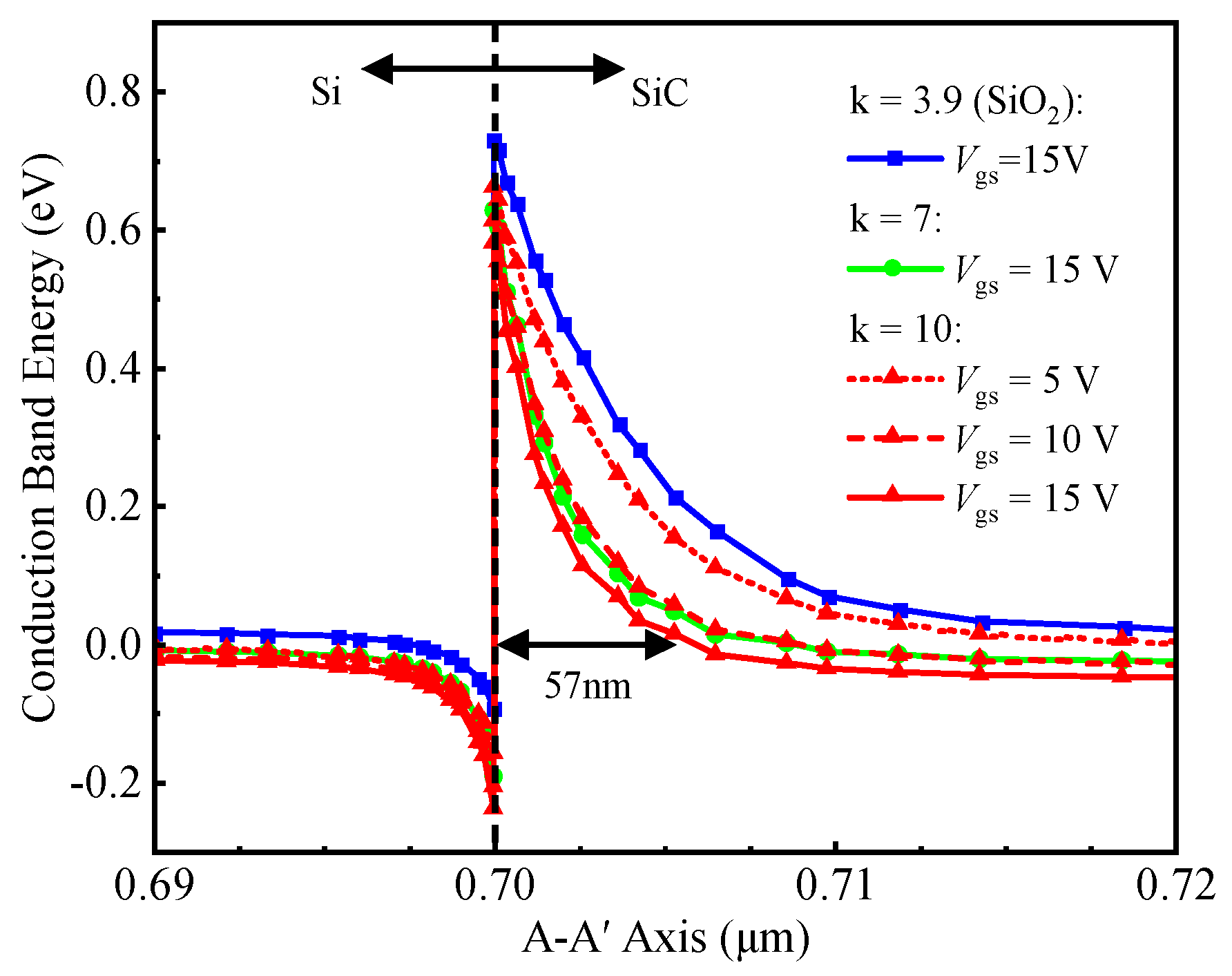 Figure 4 shows the conduction band energy along the A–A’ cutline [in Figure 1b] under varying k-values and Vgs. At Vgs = Vds = 0 V, the 0.62 μm depletion layer (in Figure 2) sustains drain voltage by blocking electron flow from Si P-ch to SiC CSL, enabled by heterojunction and P-well/CSL junction effects. Within effective tunneling distance, electrons tunnel through the heterojunction barrier into the SiC conduction band. Increasing Vgs enhances electron accumulation near the gate trench, thinning the heterojunction barrier. This enhanced accumulation reduces the width of the heterojunction barrier, thereby facilitating electron tunneling. At Vgs = 15 V and k = 10, the barrier thickness decreases to 57 nm, enabling efficient electron tunneling from silicon to SiC and forming a forward tunneling current.