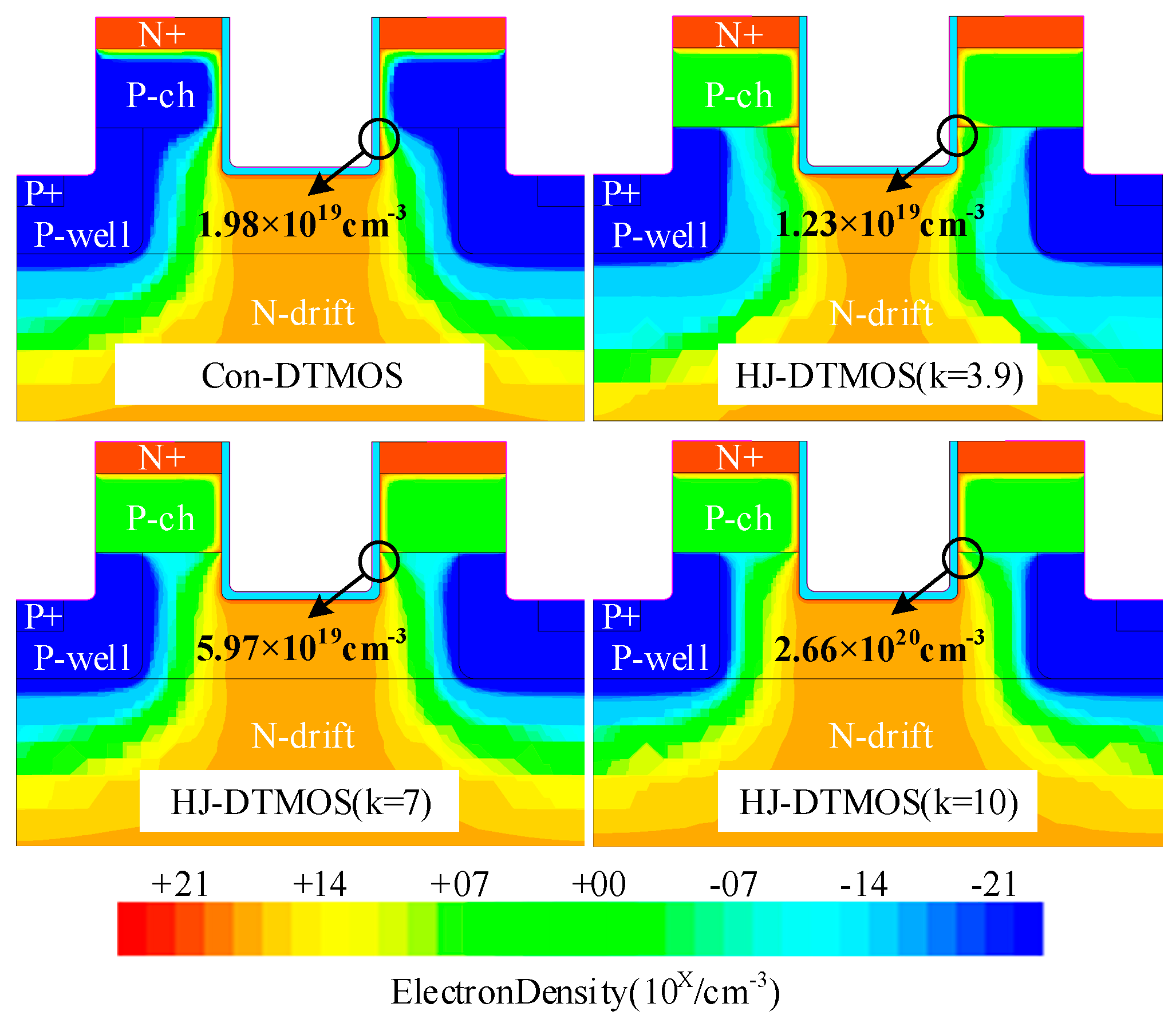 Figure 5. Electron density distribution of Con-DTMOS and HJ-DTMOS (k = 3.9, 7, 10) at Vgs = 15 V and Vds = 5 V.