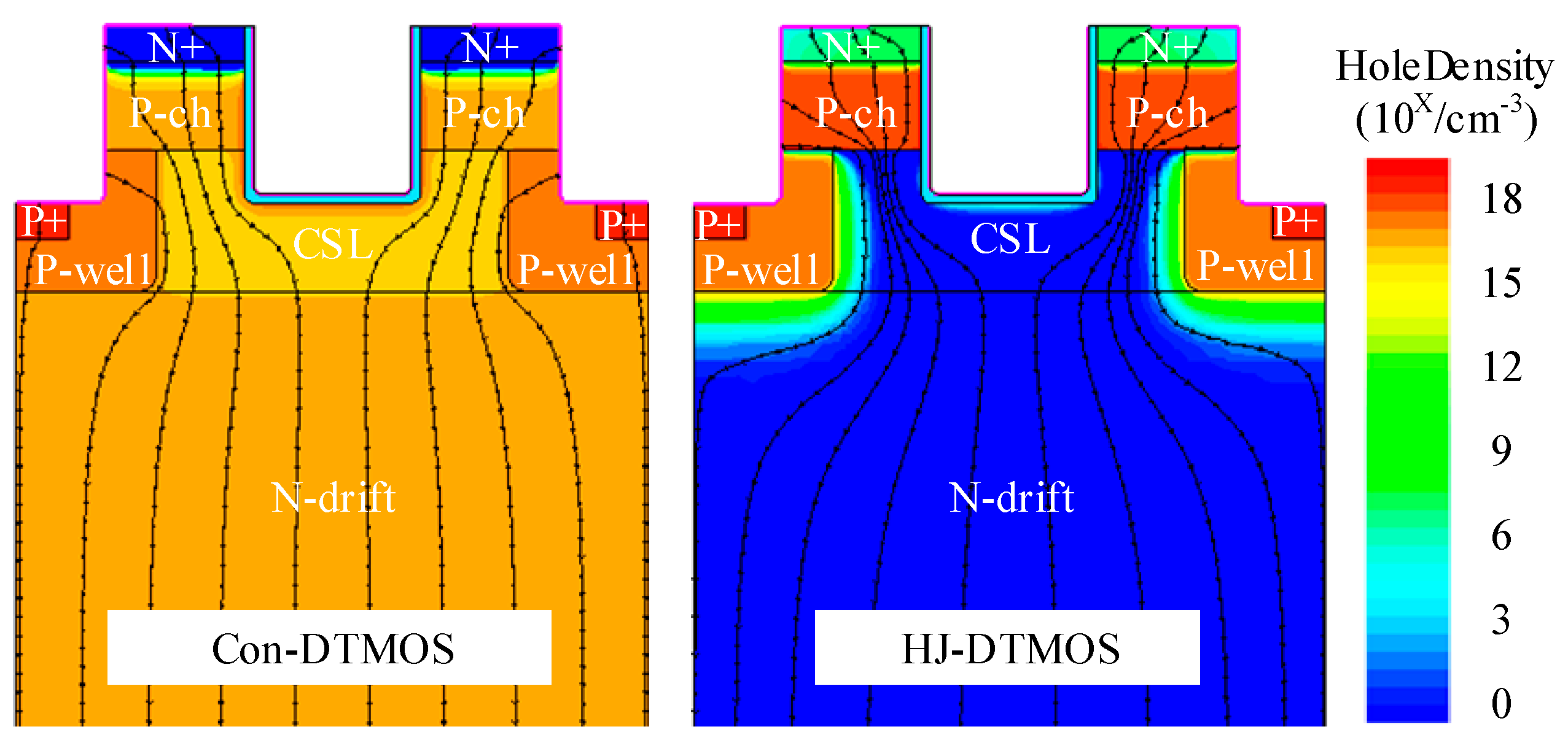 Figure 6. Hole density and total current flowlines distribution for Con-DTMOS and HJ-DTMOS (k = 10) at Ids = −100 A/cm2.