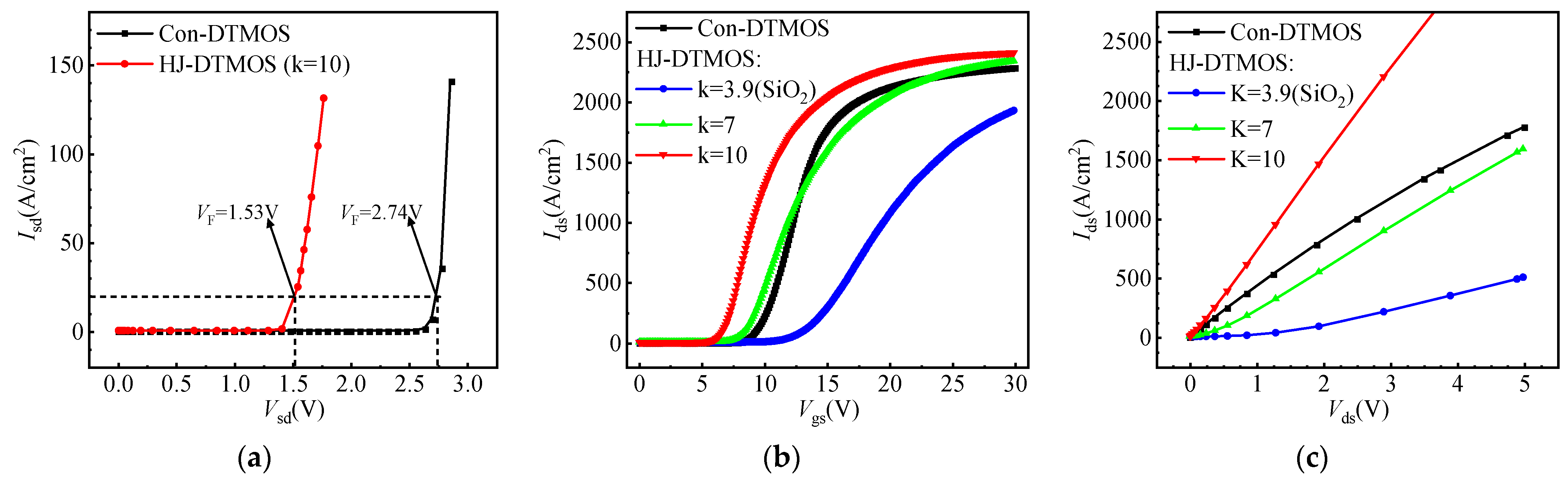 Figure 7. (a) Reverse conduction I–V characteristics of the Con-DTMOS and HJ-DTMOS under Vgs = –5 V. (b) Transfer characteristics and (c) output I–V characteristics of the Con-DTMOS and HJ-DTMOS at various k-values.
