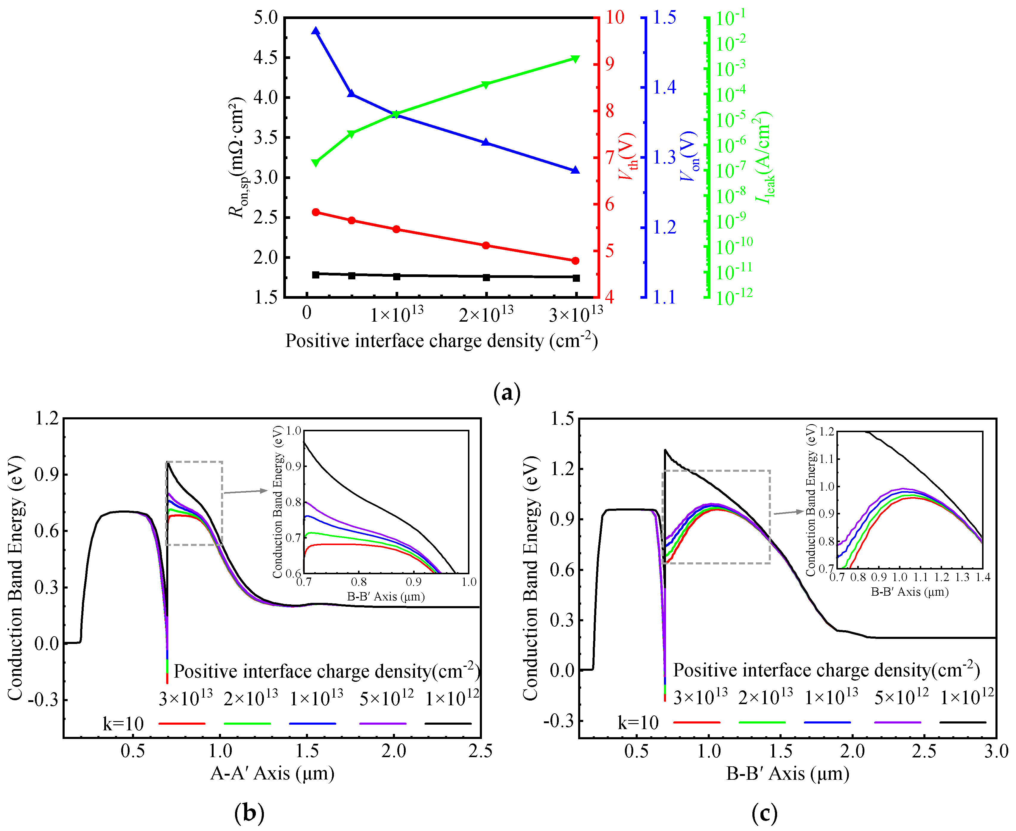 Figure 9. (a) Dependence of Ron,sp, Vth, Von, and Ileak on the positive interface charge density. Energy band diagrams at thermal equilibrium along the (b) A–A′ and (c) B–B′ cut-lines for different positive interface charge densities.