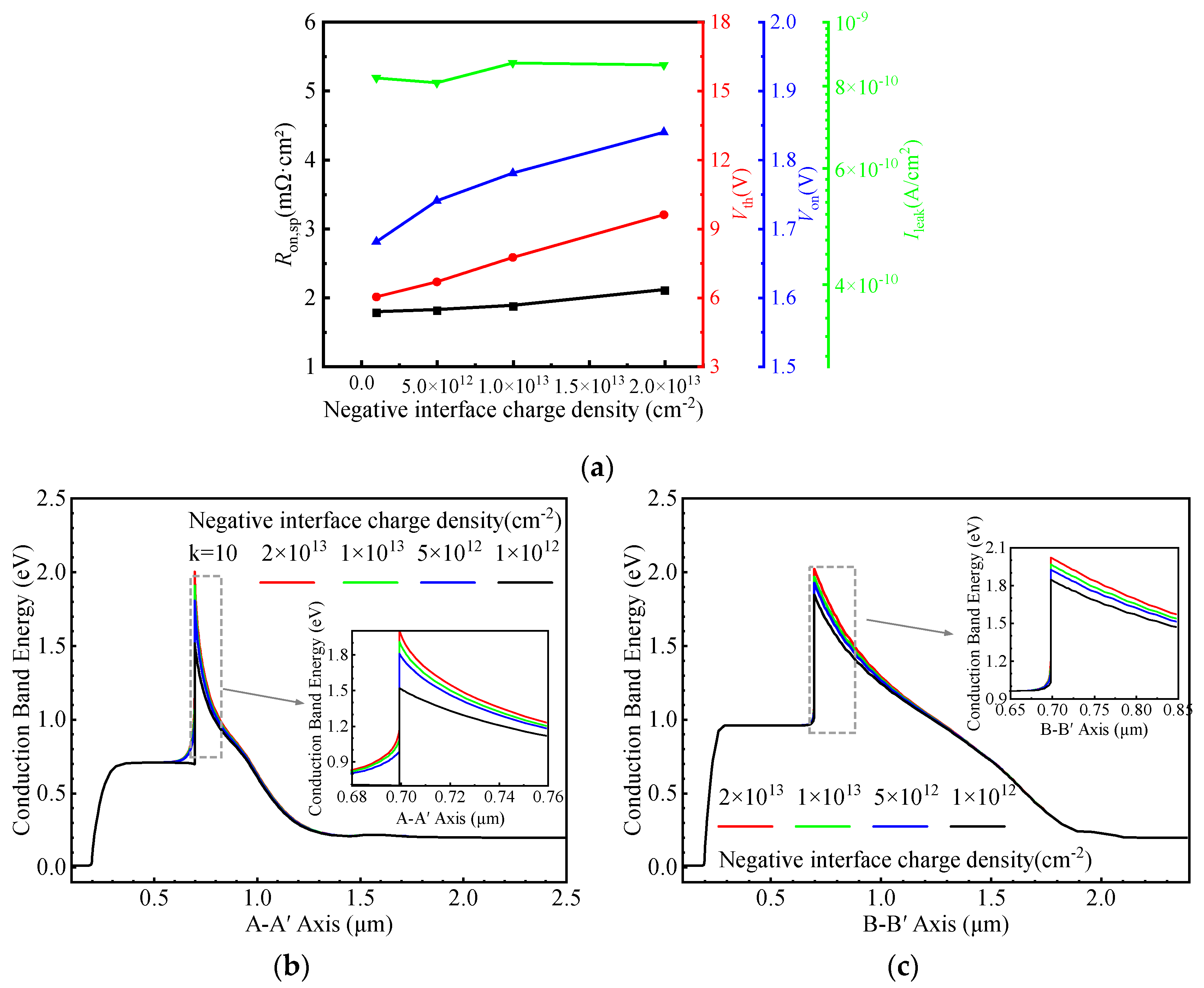 Figure 10. (a) Dependence of Ron,sp, Vth, Von, and Ileak on the negative interface charge density. Energy band diagrams at thermal equilibrium along the (b) A–A′ and (c) B–B′ cut-lines for different negative interface charge densities.