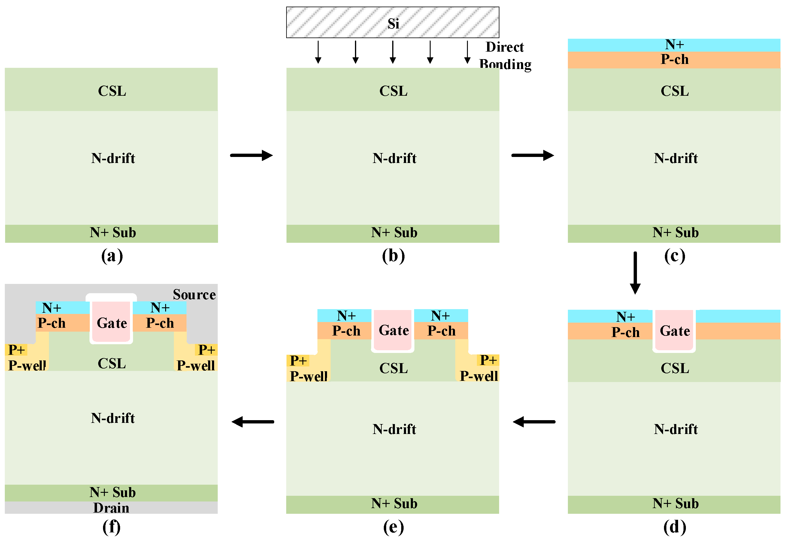 Figure 11. Key fabrication process steps for the HJ-DTMOS: (a) Form the epitaxial N-drift layer and CSL on N+ substrate; (b) Form Si/SiC heterostructures by direct bonding; (c) Form the P-ch region and N+ source region by double implantation; (d) Etch the gate trench, deposit a high-k gate dielectric by ALD, and deposit polysilicon for the gate; (e) Etch source trench and ion implantation to form the P-well region and P+ region; and (f) Form the source and drain electrodes.