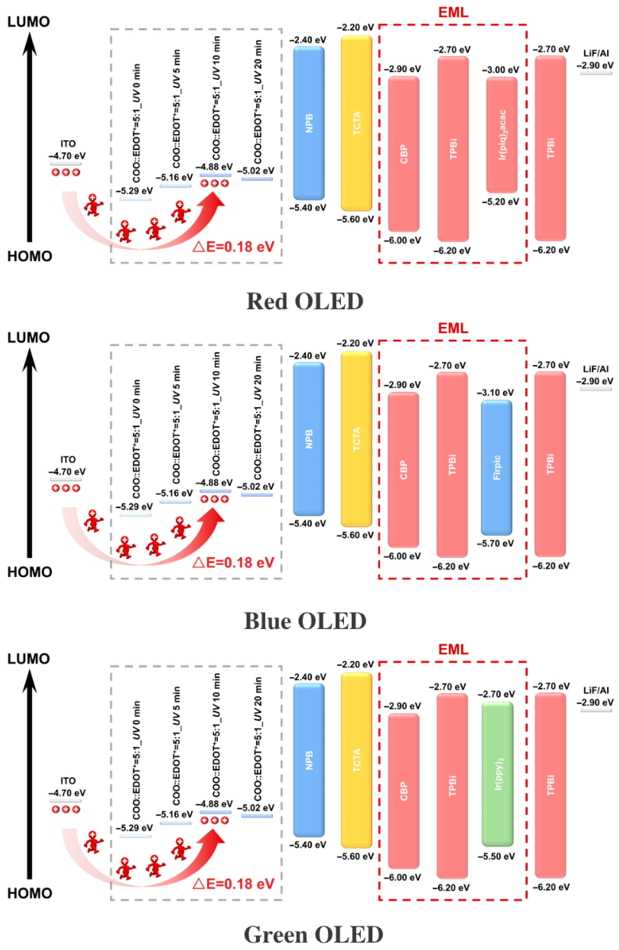 Figure 3 depicts the energy level diagrams of the RGB OLED devices. The energy level data were provided by PhiChem Corporation. These diagrams systematically elucidate the energy level alignment mechanism across the entire functional stack in each device. A consistent device architecture employs ITO as the anode, with a highest occupied molecular orbital (HOMO) energy level of approximately −4.70 eV, combined with a hole transport layer (HTL) composed of 3,4-ethylenedioxythiophene oxocarbenium ion (COO::EDOT