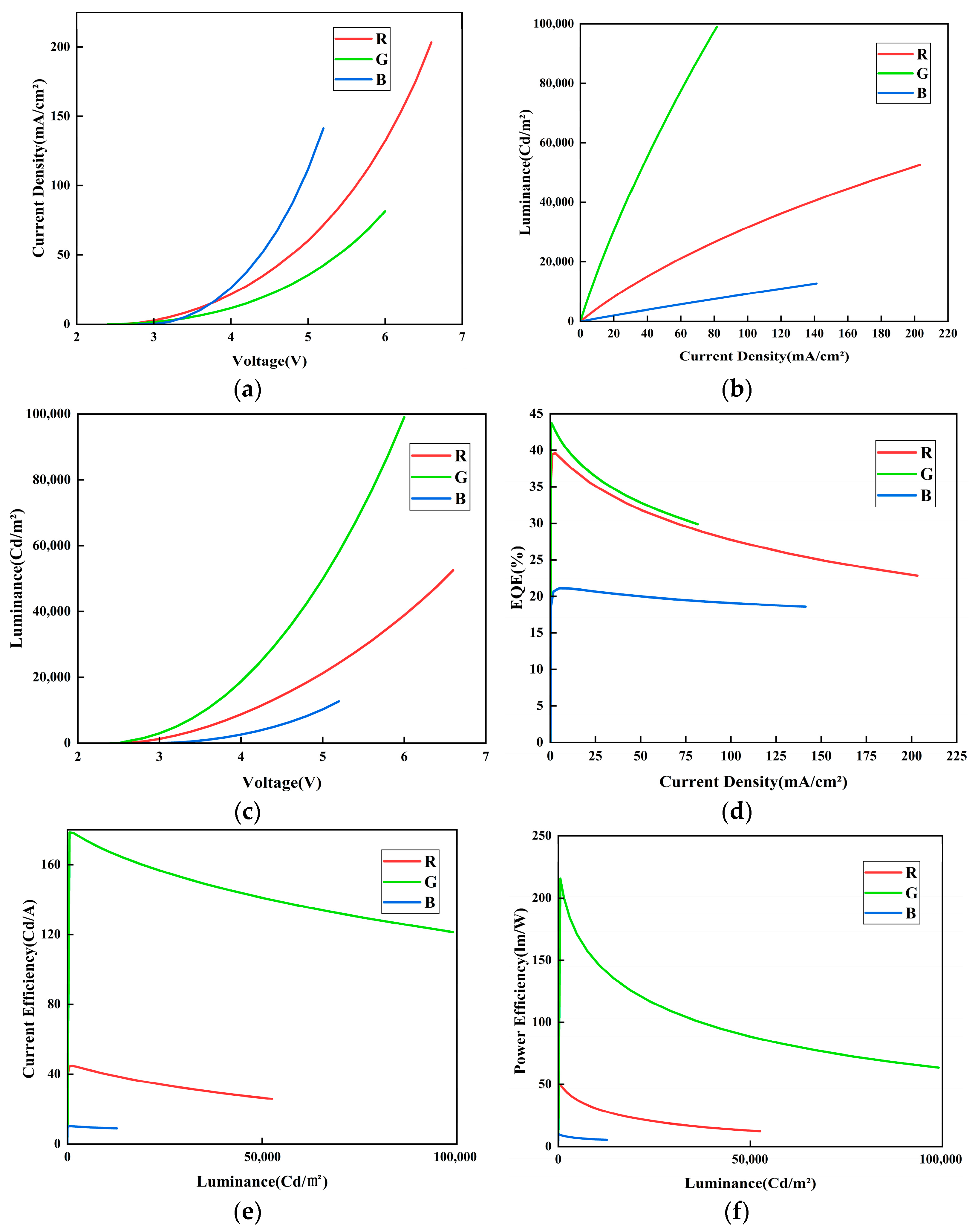 Figure 4. These curves systematically depict the electroluminescent behavior of the RGB OLEDs. In the J–V curve, the blue device was observed to show the most rapid increase in current density with voltage, which is attributed to its favorable energy level alignment. In contrast, the green device exhibited the lowest current density at the same voltage, indicating more effective charge balance. Analysis of the L–J and V–L curves jointly reveals that the green device achieved the highest luminance rise rate with increasing current density, together with the lowest driving voltage at a given luminance, underscoring its high-efficiency emission capability. The blue device, however, displayed a slower luminance increase and a significantly higher operating voltage, suggesting lower charge recombination efficiency. As observed in the EQE–J curve, all three devices initially exhibited high EQE values. A relatively gentle decline in the mid-to-high current density region (J > 25 mA/cm