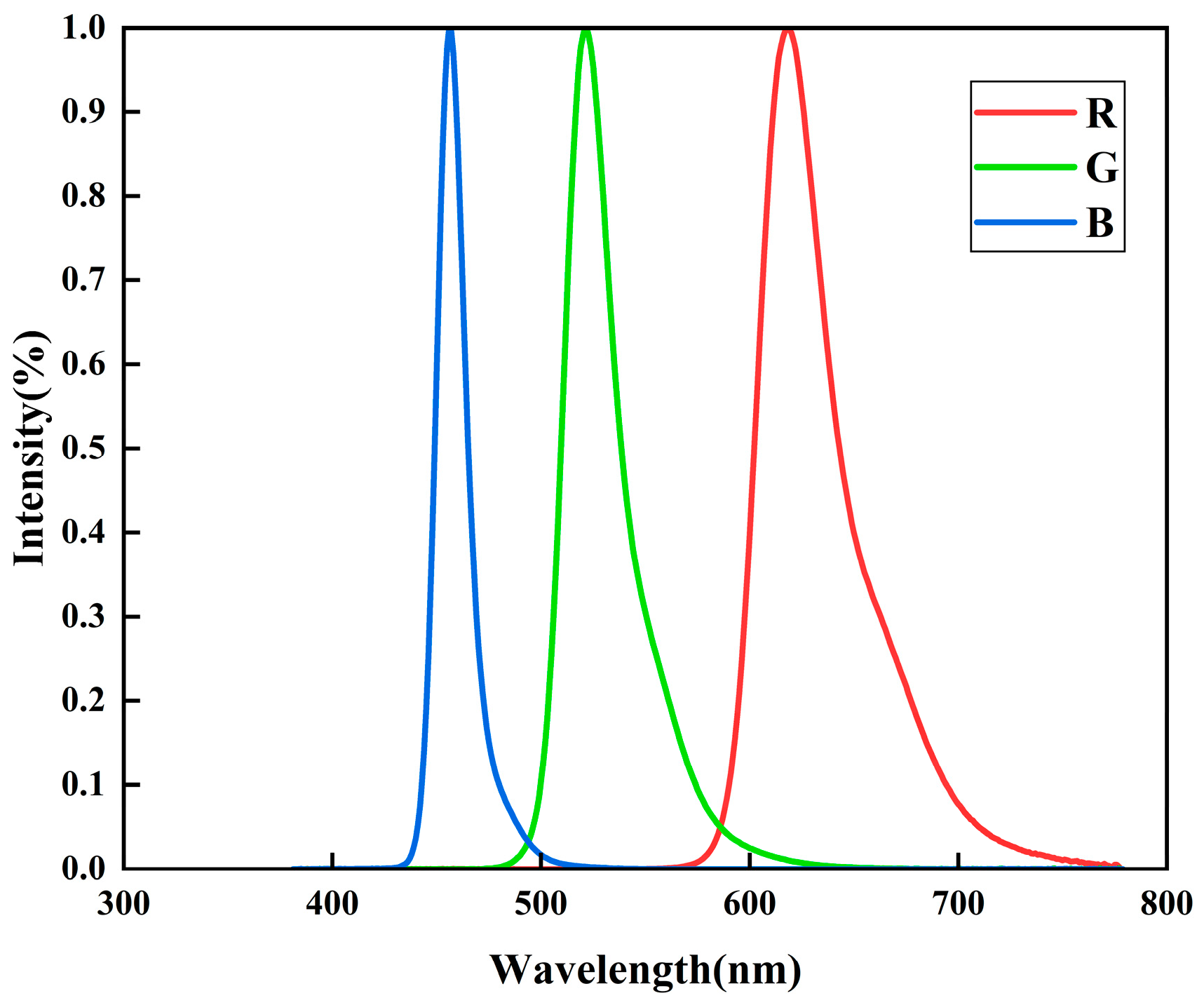 Figure 5. The blue-emitting device displays a primary emission peak centered at approximately 460 nm, with a full width at half maximum (FWHM) of about 17.4 nm. The green-emitting device shows an emission peak centered around 525 nm and an FWHM of about 28.4 nm. The red-emitting device exhibits an emission peak near 620 nm, with an FWHM of approximately 33 nm.