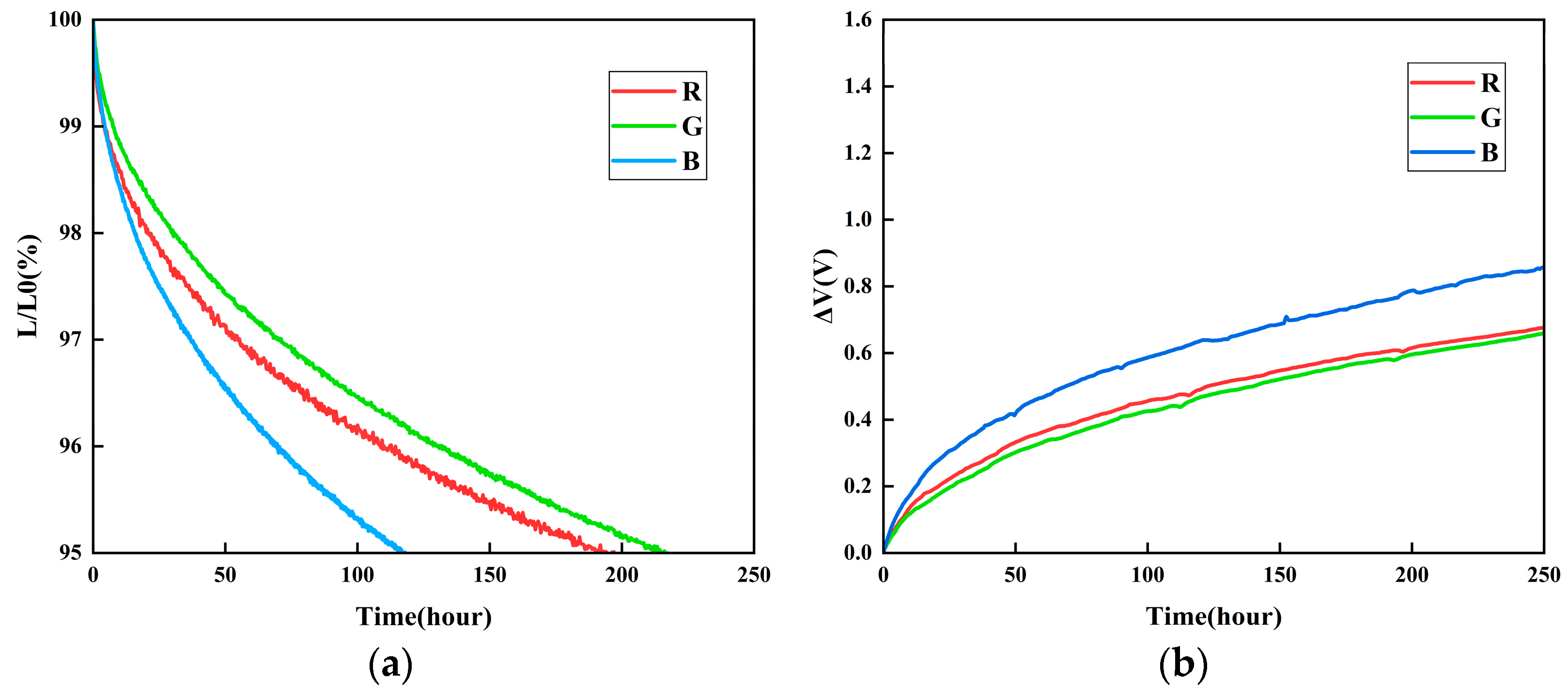 (%). The results indicate that the blue device exhibits the most pronounced luminance decay, followed by the green device, whereas the red device demonstrates the slowest degradation, suggesting inferior stability of the blue-emitting material compared to its red and green counterparts. It also presents the corresponding voltage shift curves, with the vertical axis indicating the voltage change
