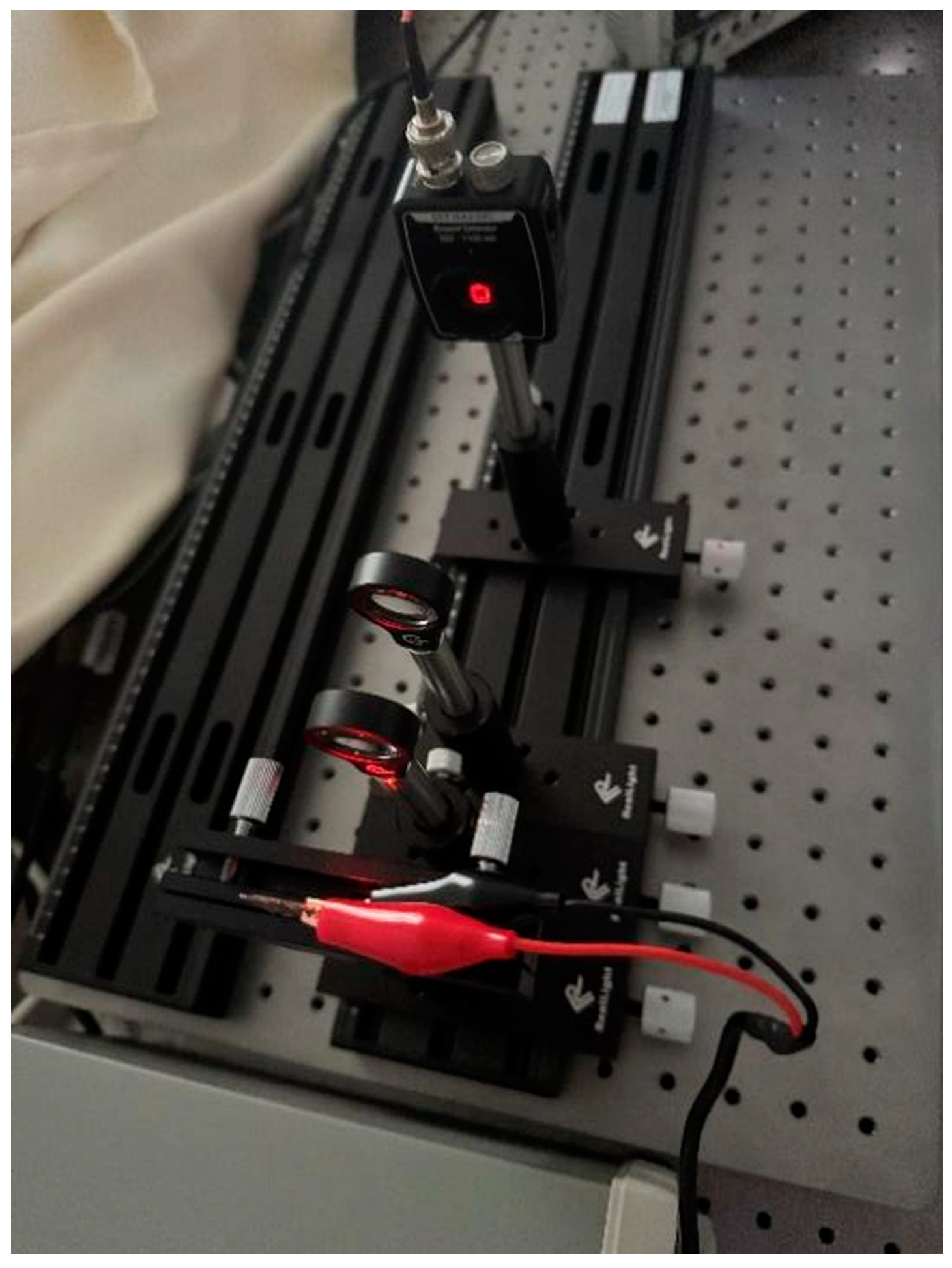 Figure 9, the optical path incorporates two plano-convex lenses for light transmission. The first lens (flat surface facing the OLED device, convex surface facing outward) collimates the divergent emission from the OLED device to reduce optical loss. The second lens, similarly oriented, focuses the collimated beam onto the photodetector. At the receiver, the time-domain signal captured by the photodetector was converted to the frequency domain using the spectrum analysis function of an oscilloscope (GW Instek MDO-2204ES, GW Instek, Suzhou, China), and the frequency response was recorded. As shown in