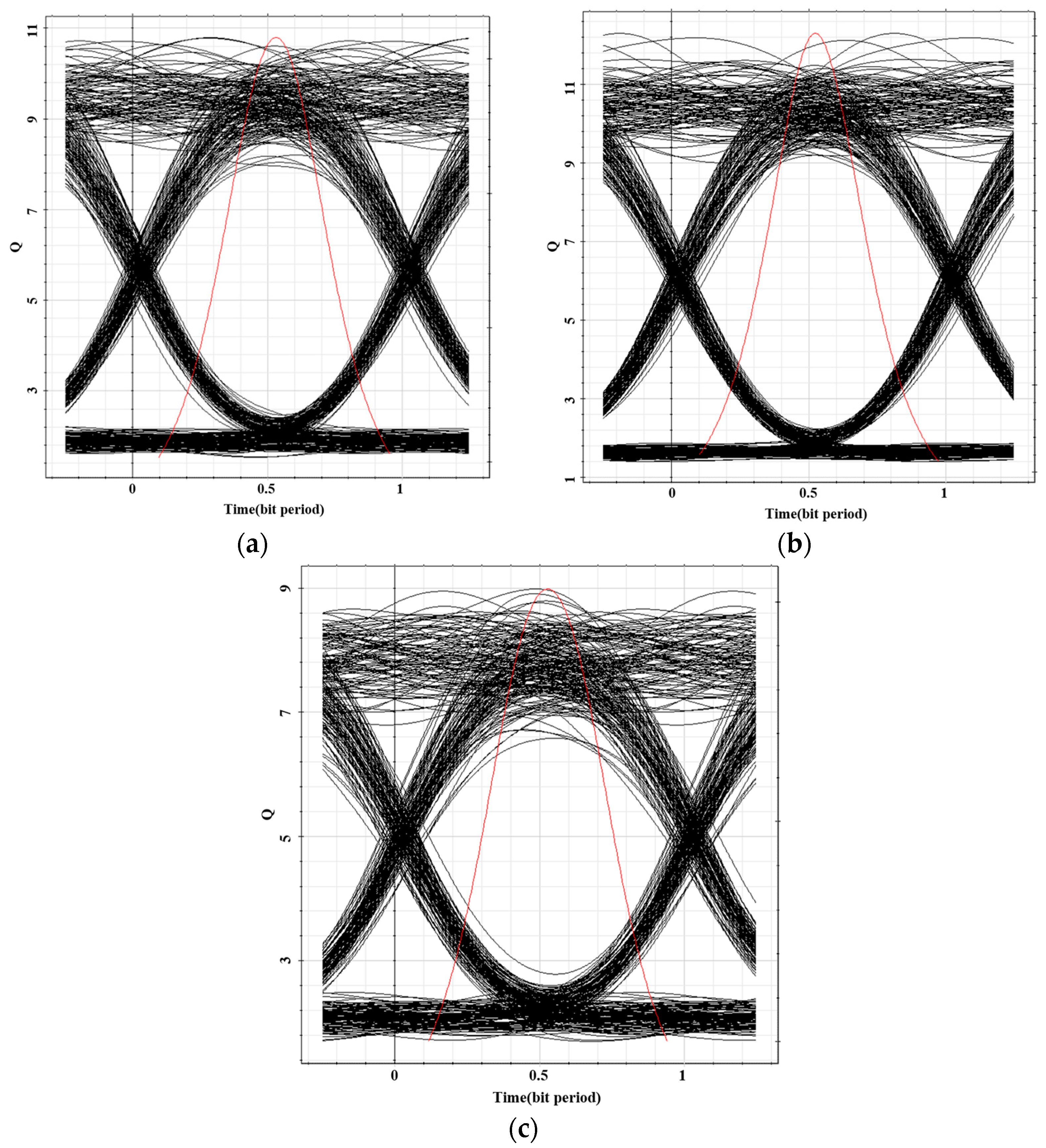Figure 15. As observed, all three-color channels exhibit clear eye diagrams with wide openings, indicating high signal quality. The signals show relatively fast rise and fall times, and the optimal receiver sensitivity is achieved when the crossing point ratio is approximately 45%. Under identical conditions, the eye-opening dimensions of the three colors are comparatively similar. The red channel achieved a maximum Q-factor of 10.79 with a minimum BER of 1.67 × 10