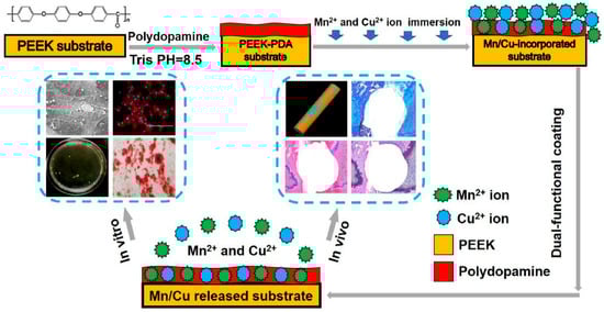 Schematic of the preparation of Mn/Cu co-deposition on PEEK using a PDA chemical surface modification and enhanced osseointegration while exerting excellent antibacterial activity in vitro and in vivo. (Adapted from [65]).